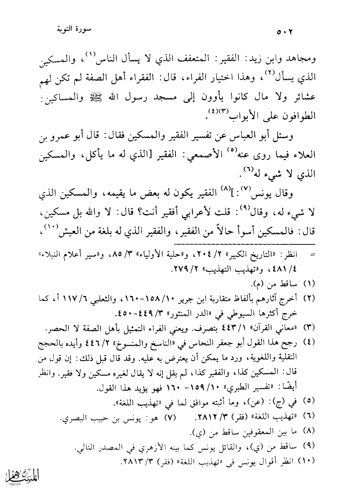 (¬4) رجح هذا القول أبو جعفر النحاس في "الناسخ والمنسوخ" 2/ 446 وأيده بالحجج النقلية واللغوية، ورد ما يمكن أن يعترض به عليه. وقد قال قبل ذلك: إن قول من قال: المسكين كذا، والفقير كذا، لم يقل إنه لا يقال لغيره مسكين ولا فقير. وانظر أيضًا: "تفسير الطبري" 10/ 159 - 160 فهو يؤيد هذا القول.