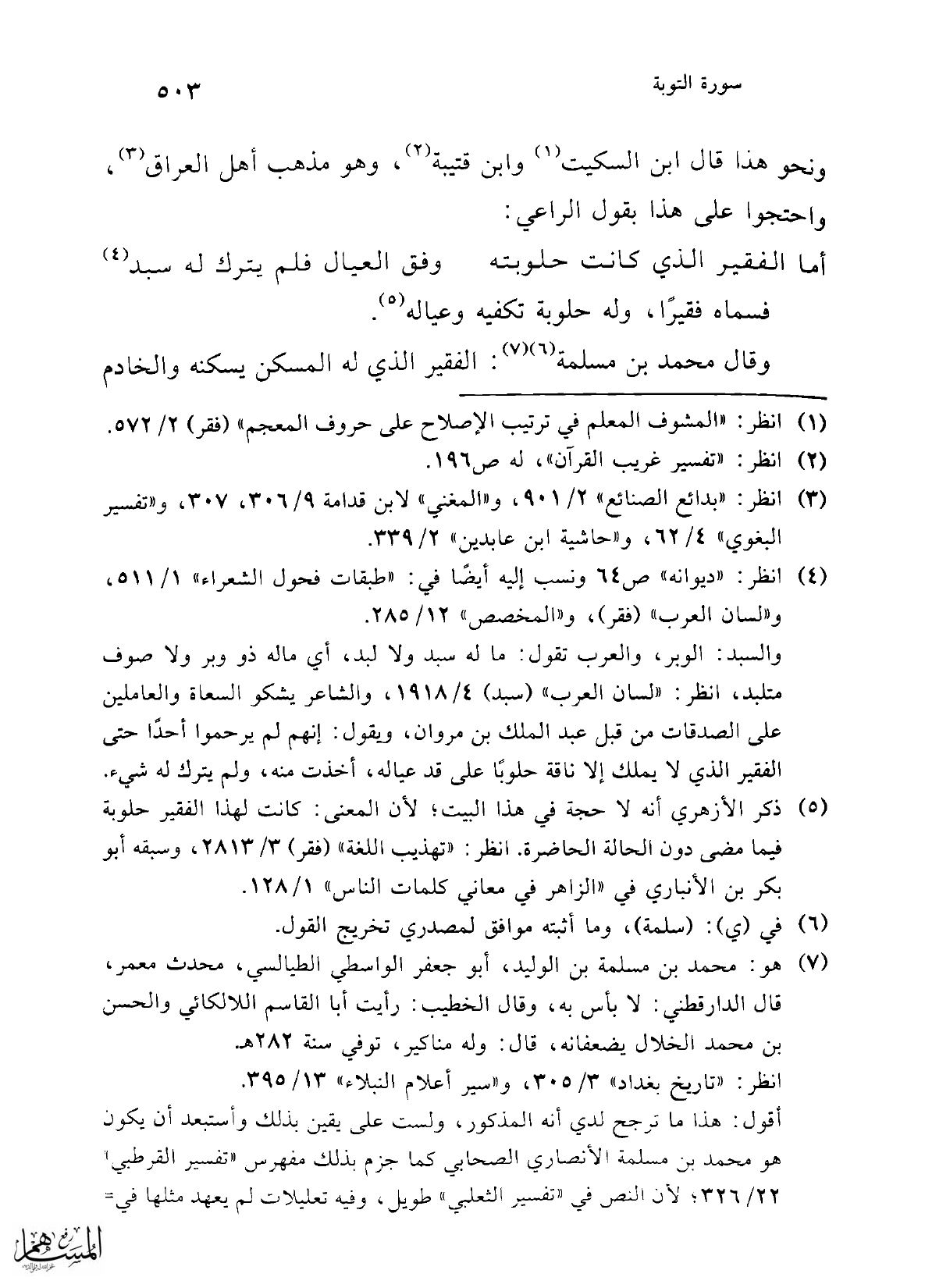 أقول: هذا ما ترجح لدي أنه المذكور، ولست على يقين بذلك وأستبعد أن يكون هو محمد بن مسلمة ألأنصاري الصحابي كما جزم بذلك مفهرس "تفسير القرطبي" 22/ 326؛ ألأن النص في "تفسير الثعلبي" طويل، وفيه تعليلات لم يعهد مثلها في =