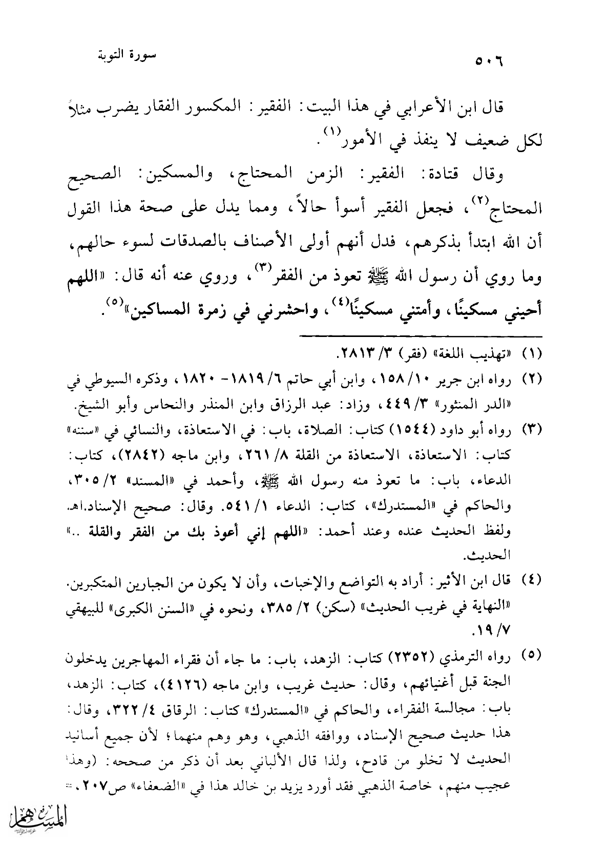 وقال قتادة: الفقير: الزمن المحتاج، والمسكين: الصحيح المحتاج (¬2)، فجعل الفقير أسوأ حالاً، ومما يدل على صحة هذا القول أن الله ابتدأ بذكرهم، فدل أنهم أولى الأصناف بالصدقات لسوء حالهم، وما روي أن رسول الله -صلى الله عليه وسلم- تعوذ من الفقر (¬3)، وروي عنه أنه قال: "اللهم أحيني مسكينًا، وأمتني مسكينًا (¬4)، واحشرني في زمرة المساكين" (¬5).