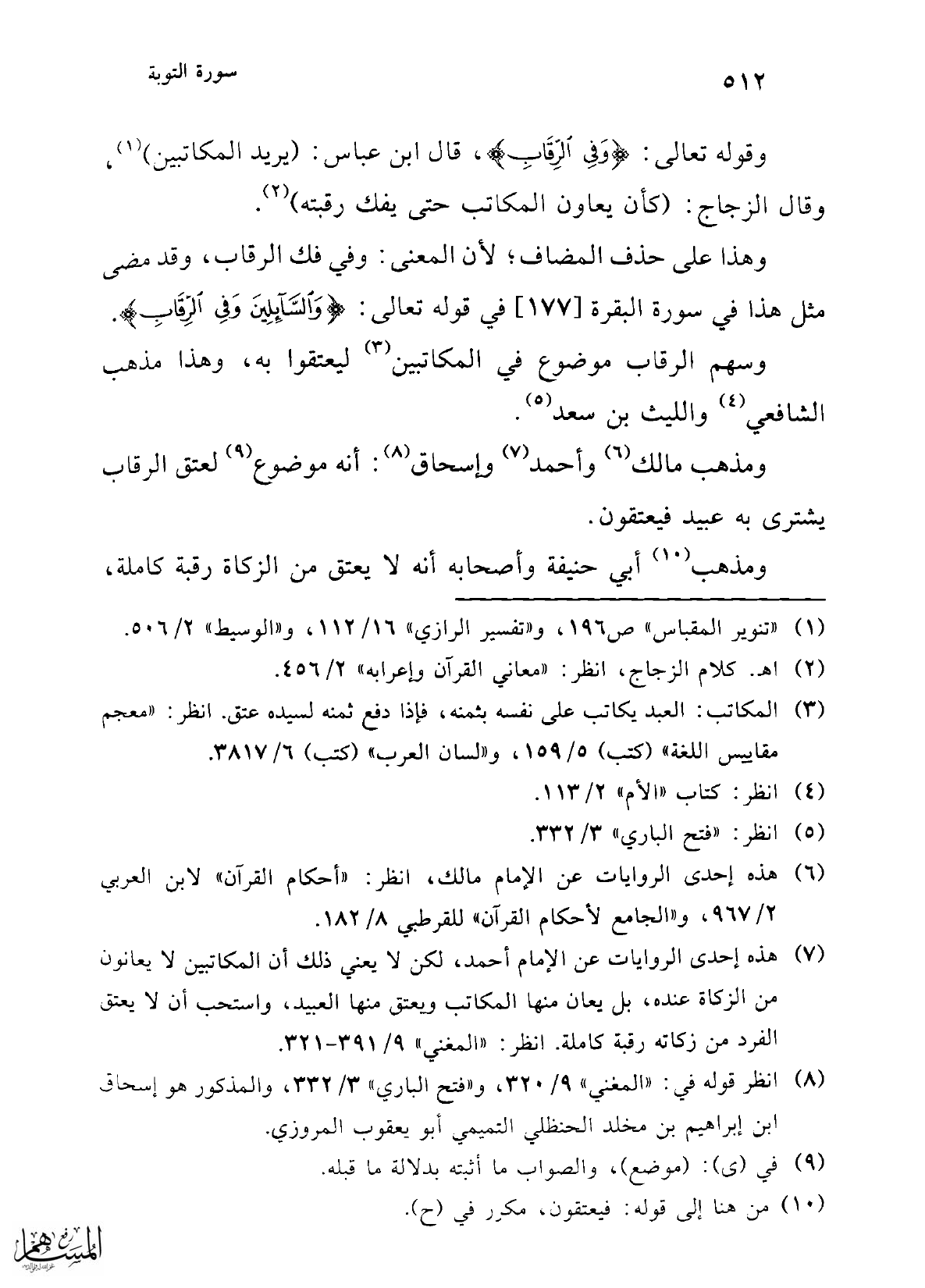 (¬7) هذه إحدى الروايات عن الإمام أحمد، لكن لا يعني ذلك أن المكاتبين لا يعانون من الزكاة عنده، بل يعان منها المكاتب ويعتق منها العبيد، واستحب أن لا يعتق الفرد من زكاته رقبة كاملة انظر: "المغني" 9/ 391 - 321.