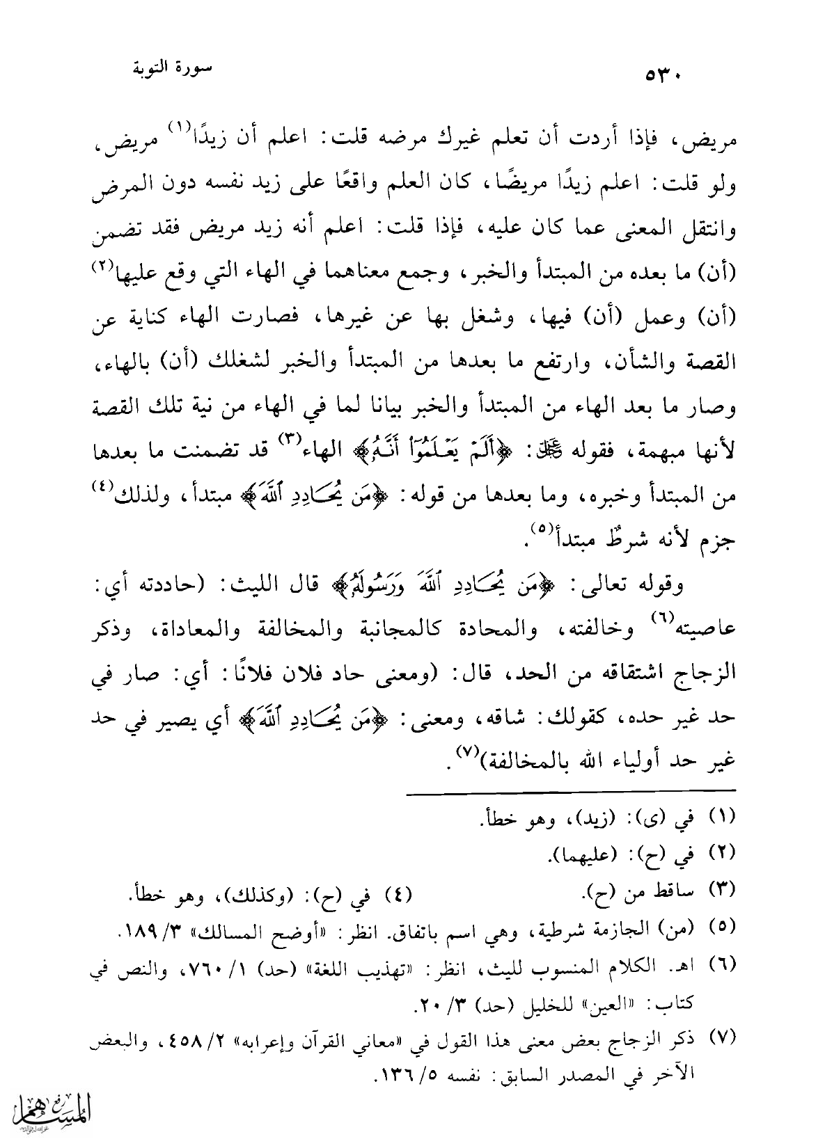 مريض، فإذا أردت أن تعلم غيرك مرضه قلت: اعلم أن زيدًا (¬1) مريض، ولو قلت: اعلم زيدًا مريضًا، كان العلم واقعًا على زيد نفسه دون المرض وانتقل المعنى عما كان عليه، فإذا قلت: اعلم أنه زيد مريض فقد تضمن (أن) ما بعده من المبتدأ والخبر، وجمع معناهما في الهاء التي وقع عليها (¬2) (أن) وعمل (أن) فيها، وشغل بها عن غيرها، فصارت الهاء كناية عن القصة والشأن، وارتفع ما بعدها من المبتدأ والخبر لشغلك (أن) بالهاء، وصار ما بعد الهاء من المبتدأ والخبر بيانا لما في الهاء من نية تلك القصة لأنها مبهمة، فقوله -عز وجل-: {أَلَمْ يَعْلَمُوا أَنَّهُ} الهاء (¬3) قد تضمنت ما بعدها من المبتدأ وخبره، وما بعدها من قوله: {مَنْ يُحَادِدِ اللَّهَ} مبتدأ، ولذلك (¬4) جزم لأنه شرطٌ مبتدأ (¬5).