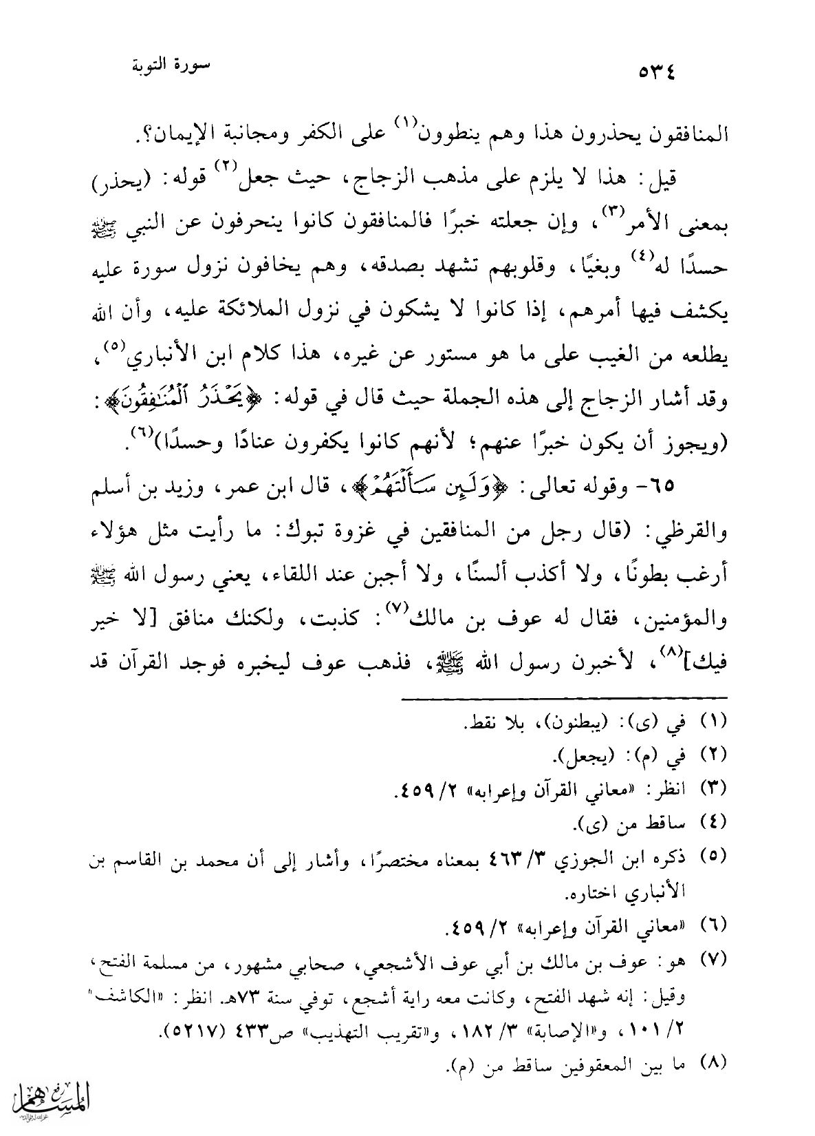 قيل: هذا لا يلزم على مذهب الزجاج، حيث جعل (¬2) قوله: (يحذر) بمعنى الأمر (¬3)، وإن جعلته خبرًا فالمنافقون كانوا ينحرفون عن النبي -صلى الله عليه وسلم- حسدًا له (¬4) وبغيًا، وقلوبهم تشهد بصدقه، وهم يخافون نزول سورة عليه يكشف فيها أمرهم، إذا كانوا لا يشكون في نزول الملائكة عليه، وأن الله يطلعه من الغيب على ما هو مستور عن غيره، هذا كلام ابن الأنباري (¬5)، وقد أشار الزجاج إلى هذه الجملة حيمث قال في قوله: {يَحْذَرُ الْمُنَافِقُونَ}: (ويجوز أن يكون خبرًا عنهم؛ لأنهم كانوا يكفرون عنادًا وحسدًا) (¬6).
