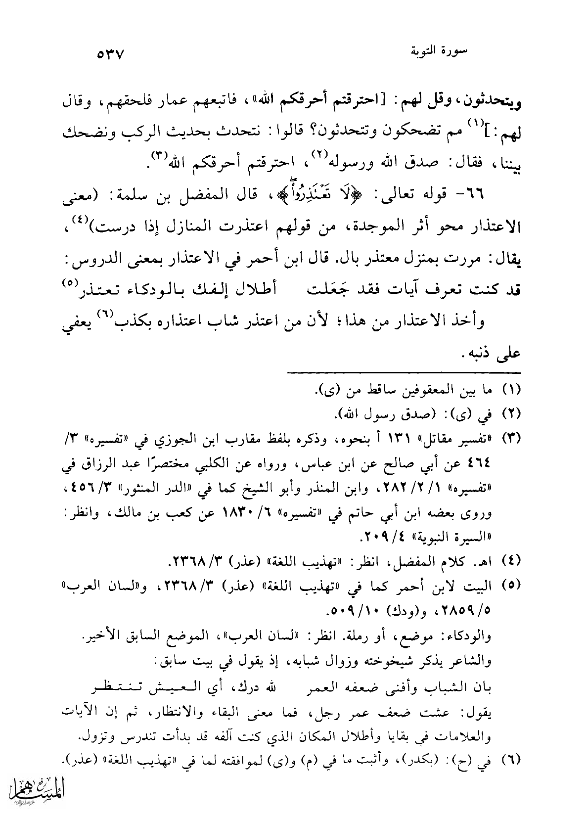 66 - قوله تعالى: {لَا تَعْتَذِرُوا}، قال المفضل بن سلمة: (معنى الاعتذار هو أثر الموجدة، من قولهم اعتذرت المنازل إذا درست) (¬4)، يقال: مررت بمنزل معتذر بال. قال ابن أحمر في الاعتذار بمعنى الدروس: