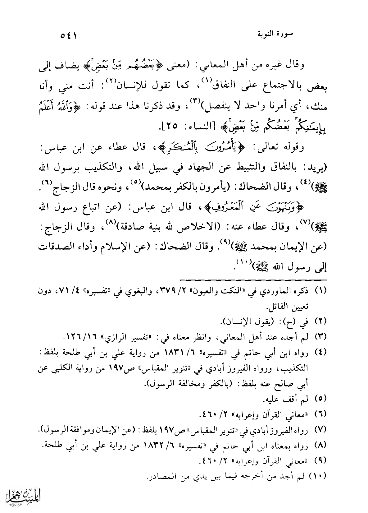 {وَيَنْهَوْنَ عَنِ الْمَعْرُوفِ}، قال ابن عباس: (عن اتباع رسول الله -صلى الله عليه وسلم- (¬7)، وقال عطاء عنه: (الإخلاص لله بنية صادقة) (¬8)، وقال الزجاج: (عن الإيمان بمحمد -صلى الله عليه وسلم-) (¬9). وقال الضحاك: (عن الإسلام وأداء الصدقات إلى رسول الله -صلى الله عليه وسلم-) (¬10).