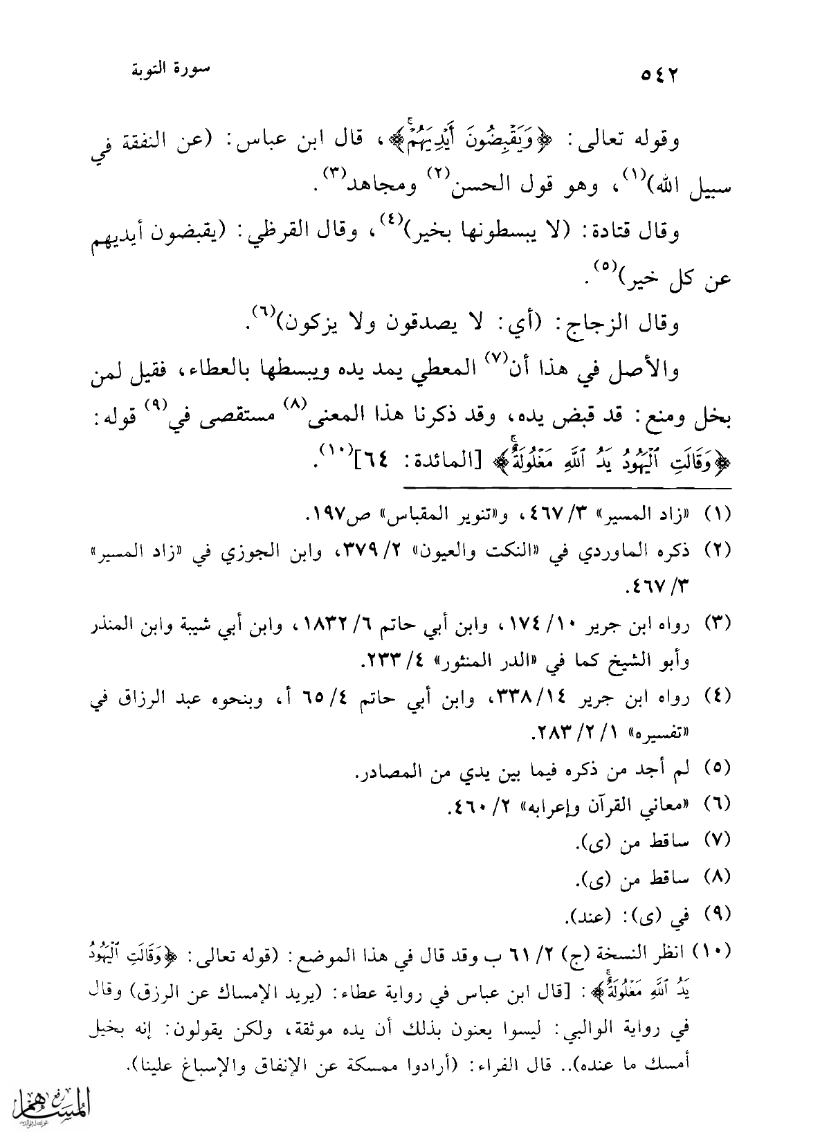 (¬10) انظر النسخة (ج) 2/ 61 ب وقد قال في هذا الموضع: (قوله تعالى: {وَقَالَتِ الْيَهُودُ يَدُ اللَّهِ مَغْلُولَةٌ}: [قال ابن عباس في رواية عطاء: (يريد الإمساك عن الرزق) وقال في رواية الوالبي: ليسوا يعنون بذلك أن يده موثقة، ولكن يقولون: إنه بخيل أمسك ما عنده) .. قال الفراء: (أرادوا ممسكة عن الإنفات والإسباغ علينا).