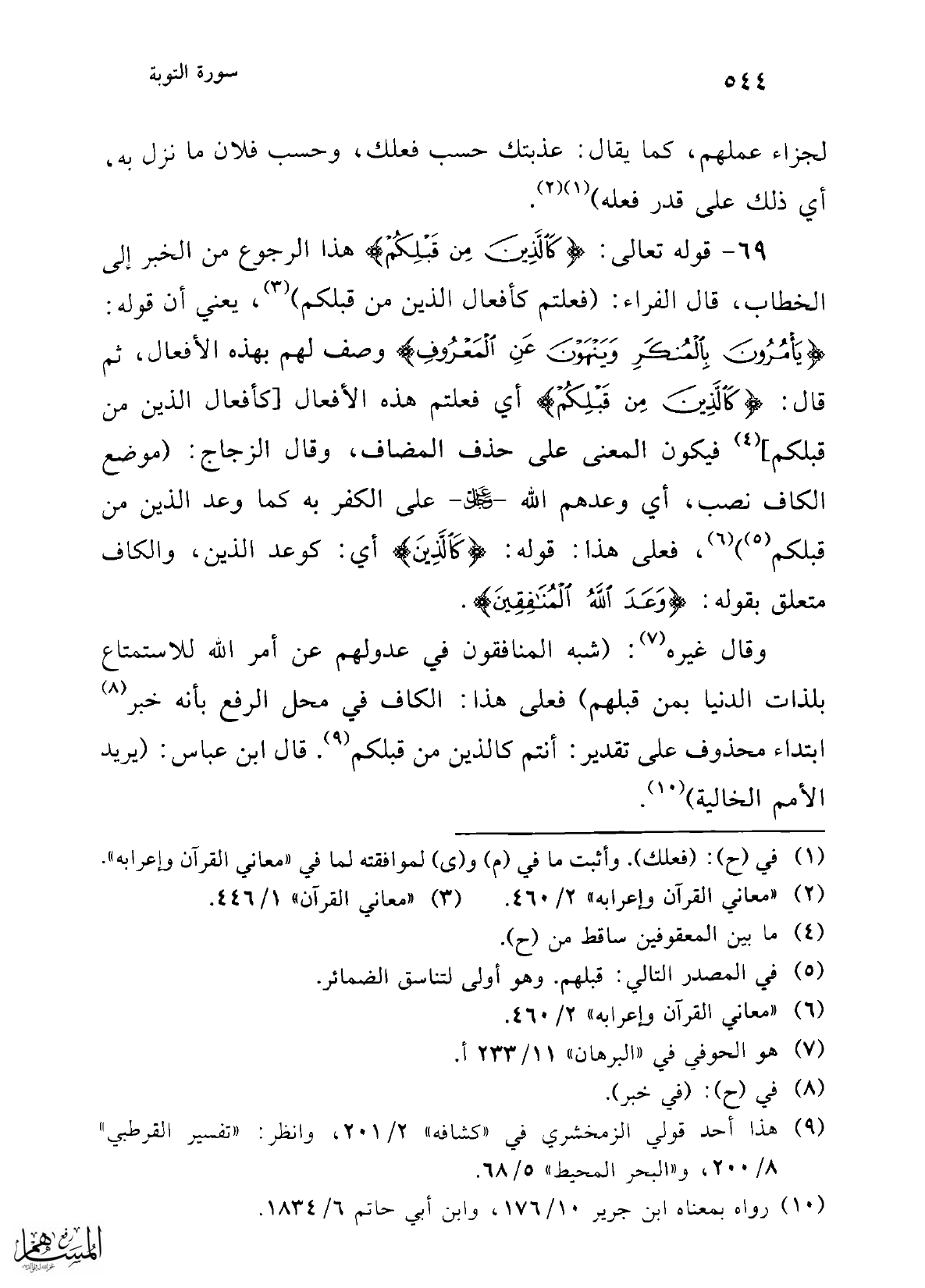 69 - قوله تعالى: {كَالَّذِينَ مِنْ قَبْلِكُمْ} هذا الرجوع من الخبر إلى الخطاب، قال الفراء: (فعلتم كأفعال الذين من قبلكم) (¬3)، يعني أن قوله: {يَأْمُرُونَ بِالْمُنْكَرِ وَيَنْهَوْنَ عَنِ الْمَعْرُوفِ} وصف لهم بهذه الأفعال، ثم قال: {كَالَّذِينَ مِنْ قَبْلِكُمْ} أي فعلتم هذه الأفعال [كأفعال الذين من قبلكم] (¬4) فيكون المعنى على حذف المضاف، وقال الزجاج: (موضع الكاف نصب، أي وعدهم الله -عز وجل- على الكفر به كما وعد الذين من قبلكم (¬5)) (¬6)، فعلى هذا: قوله: {كَالَّذِينَ} أي: كوعد الذين، والكاف متعلق بقوله: {وَعَدَ اللَّهُ الْمُنَافِقِينَ}.