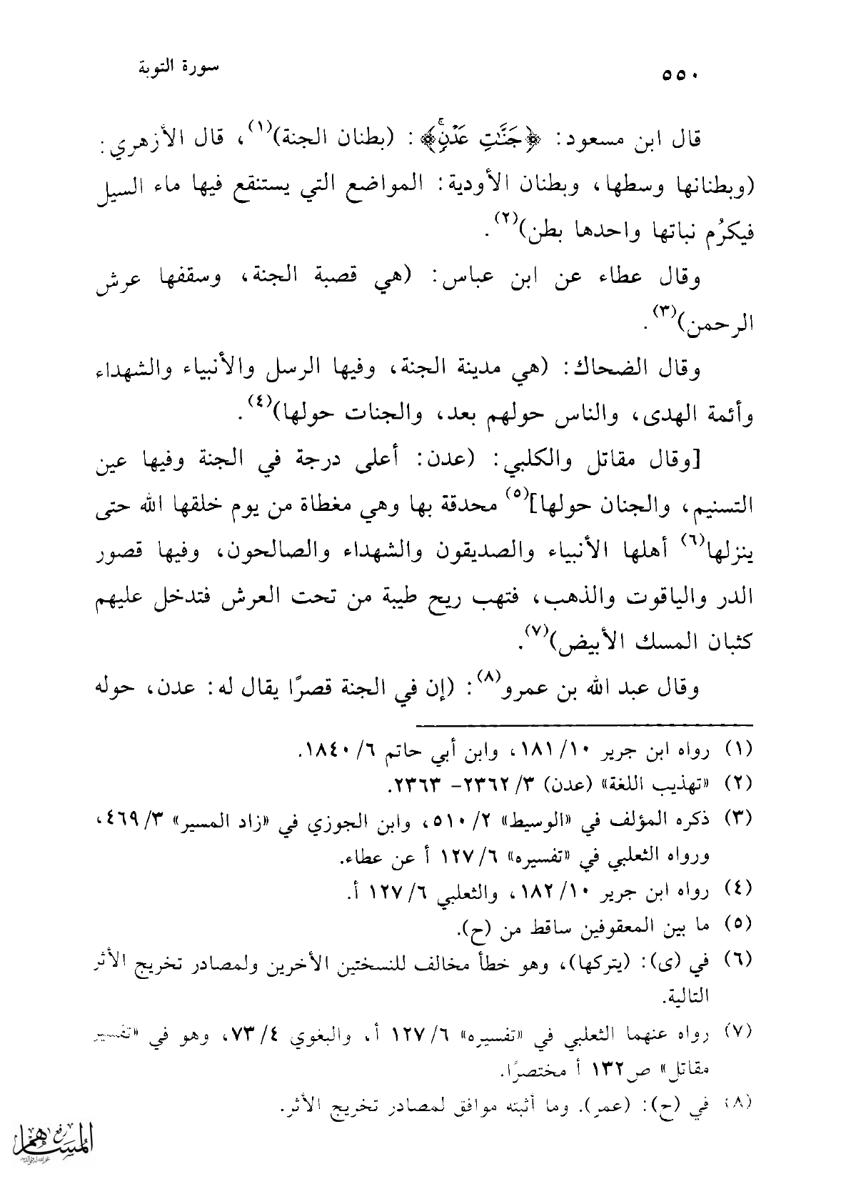 قال ابن مسعود: {جَنَّاتِ عَدْنٍ}: (بطنان الجنة) (¬1)، قال الأزهري: (وبطنانها وسطها، وبطنان الأودية: المواضع التي يستنقع فيها ماء السيل فيكرُم نباتها واحدها بطن) (¬2).