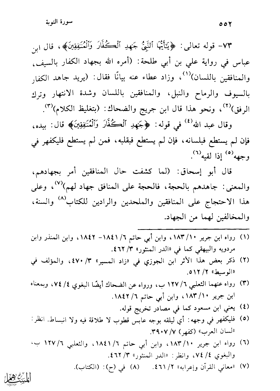 قال أبو إسحاق: (لما كشفت حال المنافقين أمر بجهادهم، والمعنى: جاهدهم بالحجة، فالحجة على المنافق جهاد لهم) (¬7)، وعلى هذا الاحتجاج على المنافقين والملحدين والرادين للكتاب (¬8) والسنة، والمخالفين لهما من الجهاد.