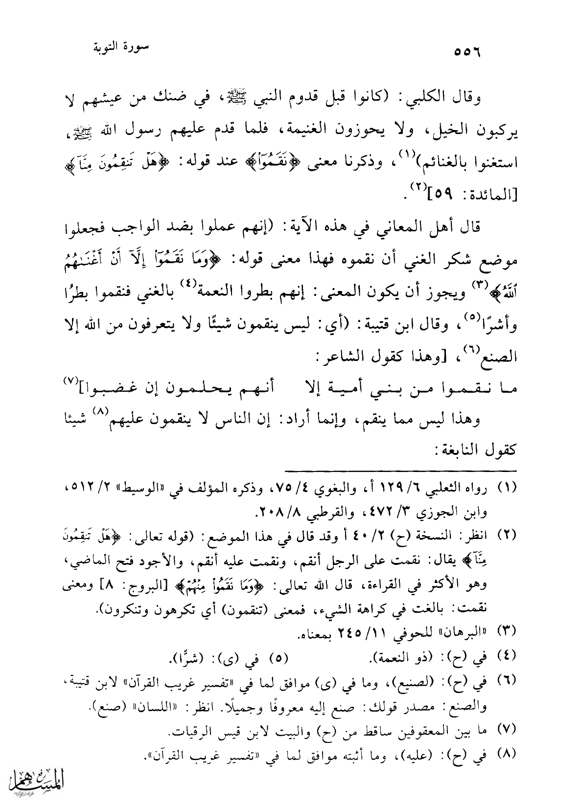 قال أهل المعاني في هذه الآية: (إنهم عملوا بضد الواجب فجعلوا موضع شكر الغني أن نقموه فهذا معنى قوله: {وَمَا نَقَمُوا إِلَّا أَنْ أَغْنَاهُمُ اللَّهُ} (¬3) ويجوز أن يكون المعنى: إنهم بطروا النعمة (¬4) بالغني فنقموا بطرُا وأشرًا (¬5)، وقال ابن قتيبة: (أي: ليس ينقمون شيئًا ولا يتعرفون من الله إلا الصنع (¬6)، [وهذا كقول الشاعر: