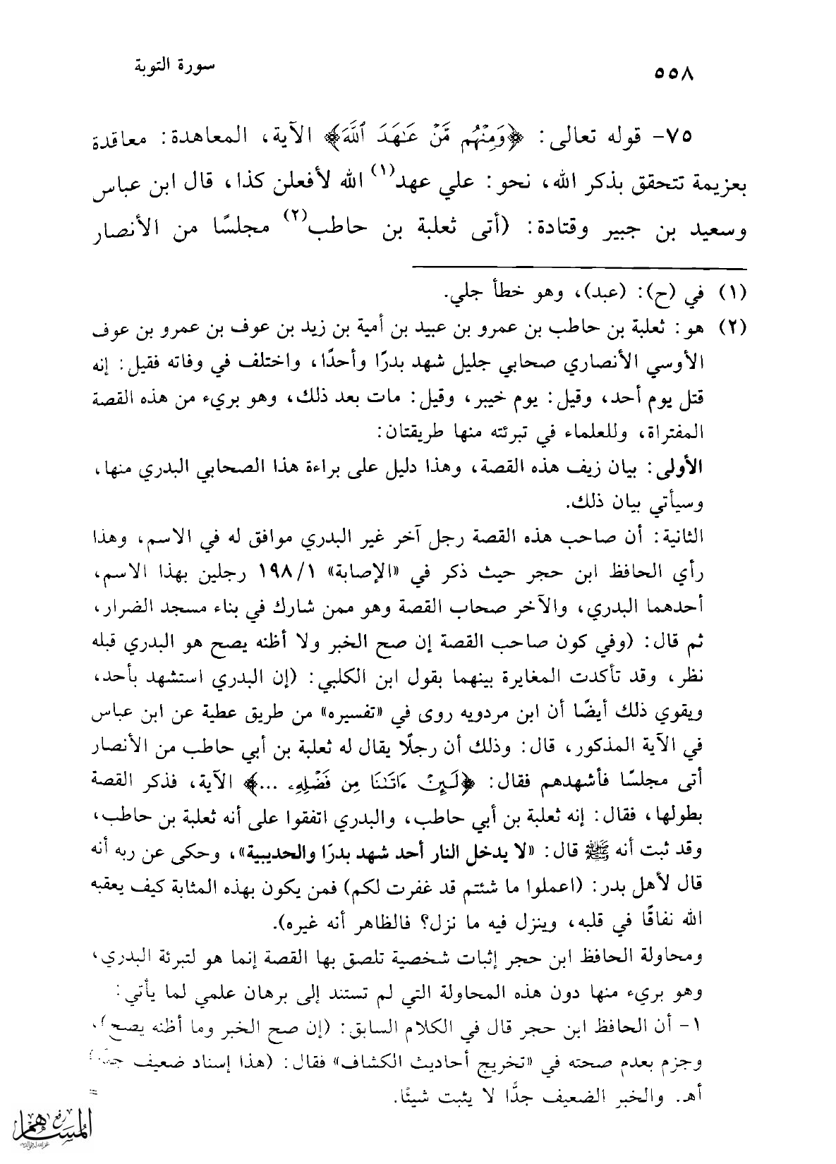 الثانية: أن صاحب هذه القصة رجل آخر غير البدري موافق له في الاسم، وهذا رأي الحافظ ابن حجر حيث ذكر في "الإصابة" 1/ 198 رجلين بهذا الاسم، أحدهما البدري، والآخر صحاب القصة وهو ممن شارك في بناء مسجد الضرار، ثم قال: (وفي كون صاحب القصة إن صح الخبر ولا أظنه يصح هو البدري قبله نظر، وقد تأكدت المغايرة بينهما بقول ابن الكلبي: (إن البدري استشهد بأحد، ويقوي ذلك أيضًا أن ابن مردويه روى في "تفسيره" من طريق عطية عن ابن عباس في الآية المذكورة، قال: وذلك أن رجلاً يقال له ثعلبة بن أبي حاطب من الأنصار أتى مجلسًا فأشهدهم فقال: {لَئِنْ آتَانَا مِنْ فَضْلِهِ} الآية، فذكر القصة بطولها، فقال: إنه ثعلبة بن أبي حاطب، والبدري اتفقوا على أنه ثعلبة بن حاطب، وقد ثبت أنه -صلى الله عليه وسلم- قال: "لا يدخل النار أحد شهد بدرًا والحديبية"، وحكى عن ربه أنه قال لأهل بدر: (اعملوا ما شئتم قد غفرت لكم) فمن يكون بهذه المثابة كيف يعقبه الله نفاقًا في قلبه، وينزل فيه ما نزل؟ فالظاهر أنه غيره).