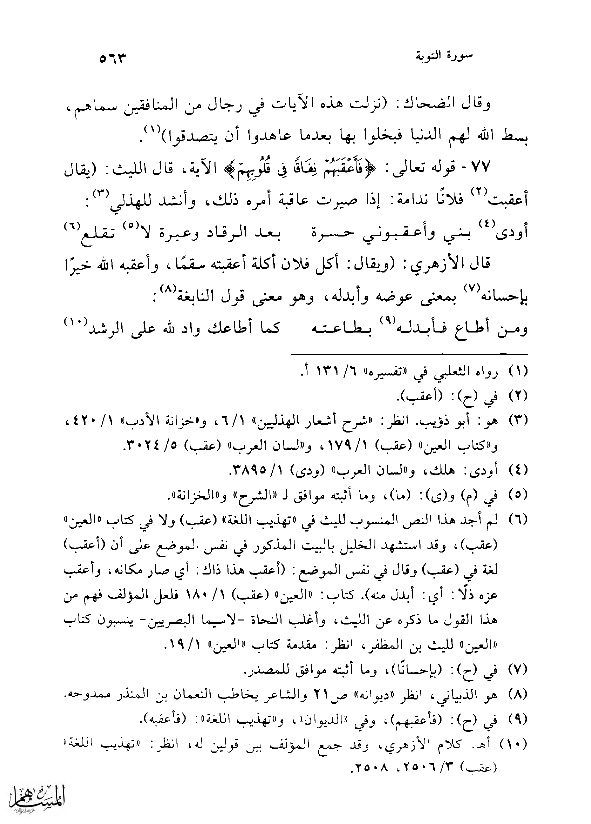 77 - قوله تعالى: {فَأَعْقَبَهُمْ نِفَاقًا فِي قُلُوبِهِمْ} الآية، قال الليث: (يقال أعقبت (¬2) فلانًا ندامة: إذا صيرت عاقبة أمره ذلك، وأنشد للهذلي (¬3):
