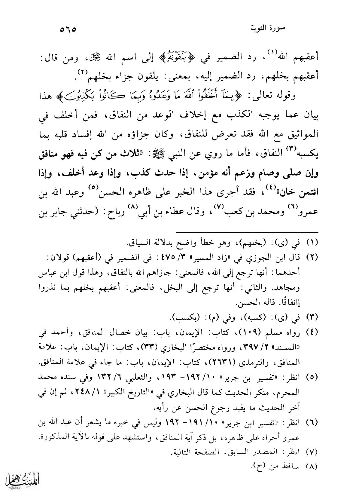 (¬2) قال ابن الجوزي في "زاد المسير" 3/ 475: في الضمير في (أعقبهم) قولان: أحدهما: أنها ترجع إلى الله، فالمعنى: جازاهم الله بالنفاق، وهذا قول ابن عباس ومجاهد. والثاني: أنها ترجع إلى البخل، فالمعنى: أعقبهم بخلهم بما نذروا إانفاقًا. قاله الحسن.