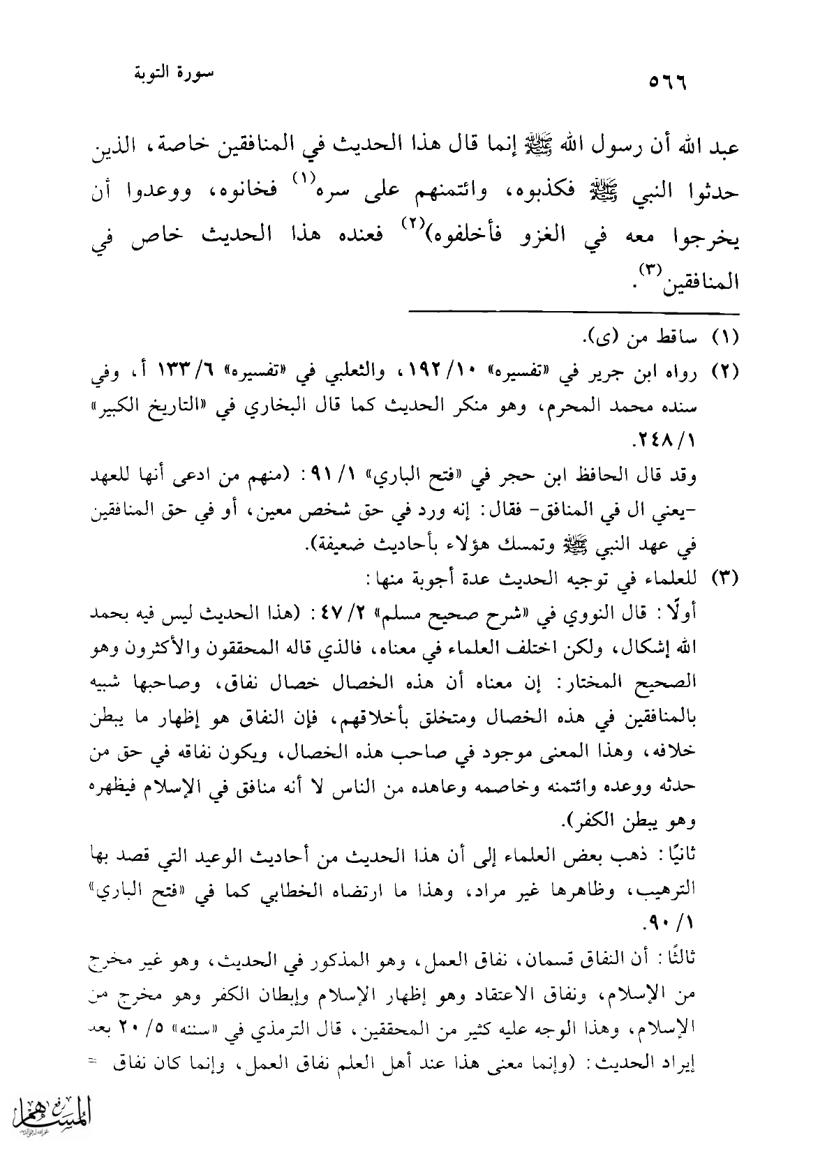 ثالثًا: أن النفاق قسمان، نفاق العمل، وهو المذكور في الحديث، وهو غير مخرج من الإسلام، ونفاق الاعتقاد وهو إظهار الإسلام وإبطان الكفر وهو مخرج من الإسلام، وهذا الوجه عليه كثير من المحققين، قال الترمذي في "سننه" 5/ 20 بعد إيراد الحديث: (وإنما معنى هذا عند أهل العلم نفاق العمل، وإنما كان نفاق =