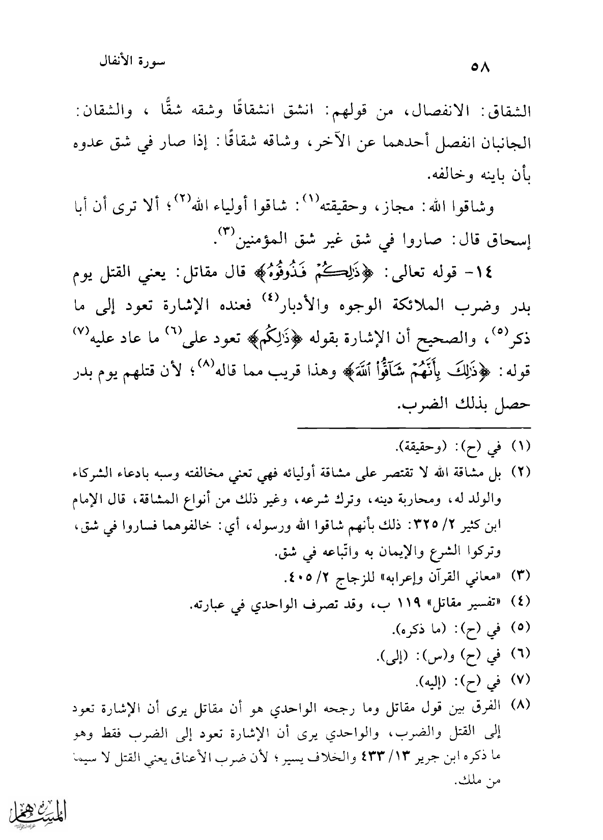 (¬8) الفرق بين قول مقاتل وما رجحه الواحدي هو أن مقاتل يرى أن الإشارة تعود إلى القتل والضرب، والواحدي يرى أن الإشارة تعود إلى الضرب فقط وهو ما ذكره ابن جرير 13/ 433 والخلاف يسير؛ لأن ضرب الأعناق يعني القتل لا سيما من ملك.