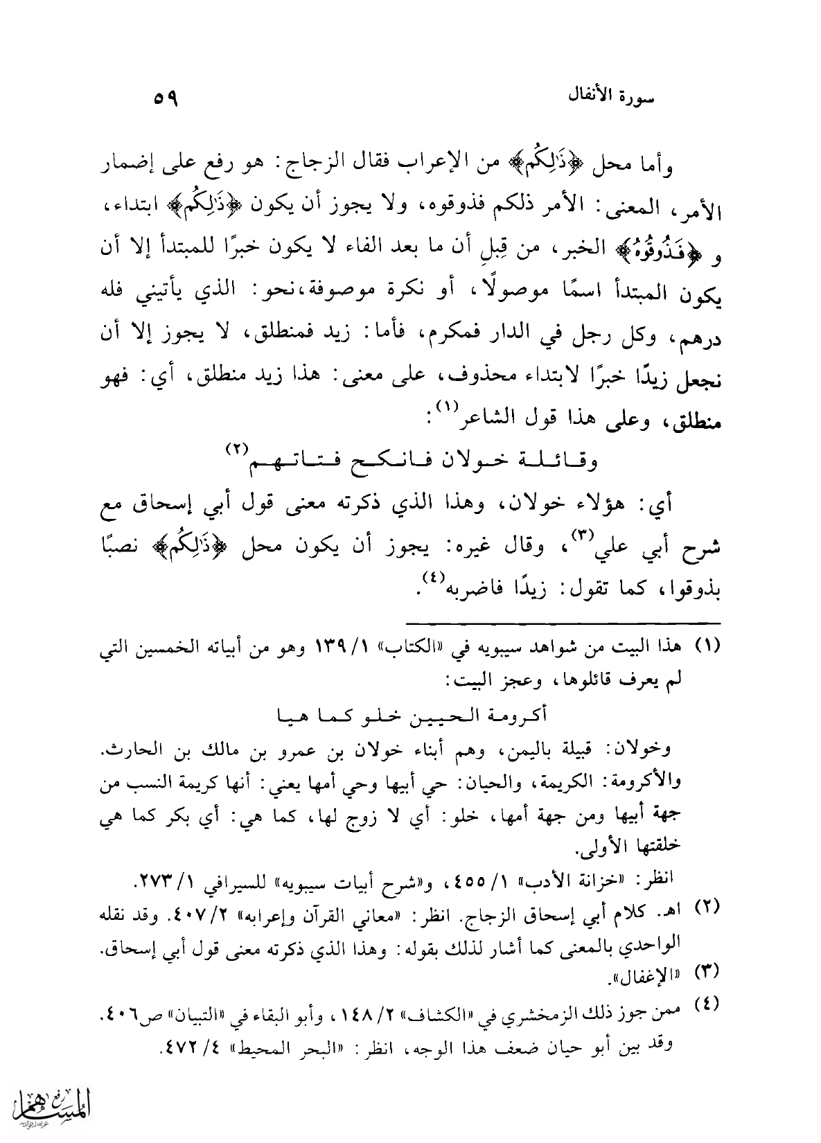 وأما محل {ذَلِكُمْ} من الإعراب فقال الزجاج: هو رفع على إضمار الأمر، المعنى: الأمر ذلكم فذوقوه، ولا يجوز أن يكون {ذَلِكُمْ} ابتداء، و {فَذُوقُوهُ} الخبر، من قِبلِ أن ما بعد الفاء لا يكون خبرًا للمبتدأ إلا أن يكون المبتدأ اسمًا موصولاً، أو نكرة موصوفة، نحو: الذي يأتيني فله درهم، وكل رجل في الدار فمكرم، فأما: زيد فمنطلق، لا يجوز إلا أن نجعل زيدًا خبرًا لابتداء محذوف، على معنى: هذا زيد منطلق، أي: فهو منطلق، وعلى هذا قول الشاعر (¬1):