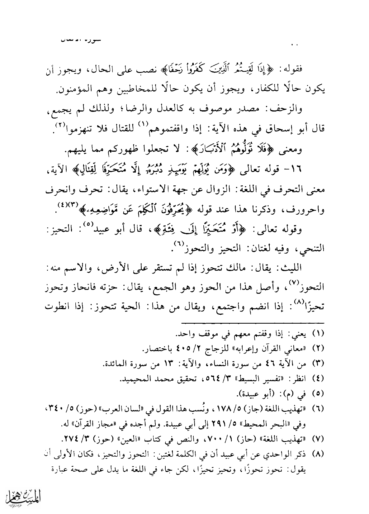 (¬8) ذكر الواحدي عن أبي عبيد أن في الكلمة لغتين: التحوز والتحيز، فكان الأولى أن يقول: تحوز تحوزًا، وتحيز تحيزًا، لكن جاء في اللغة ما يدل على صحة عبارة =