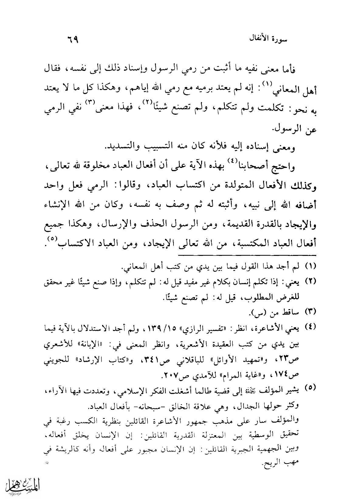 (¬5) يشير المؤلف رحمه الله إلى قضية طالما أشغلت الفكر الإسلامي، وتحددت فيها الآراء, وكثر حولها الجدال، وهي علاقة الخالق -سبحانه- بأفعال العباد.