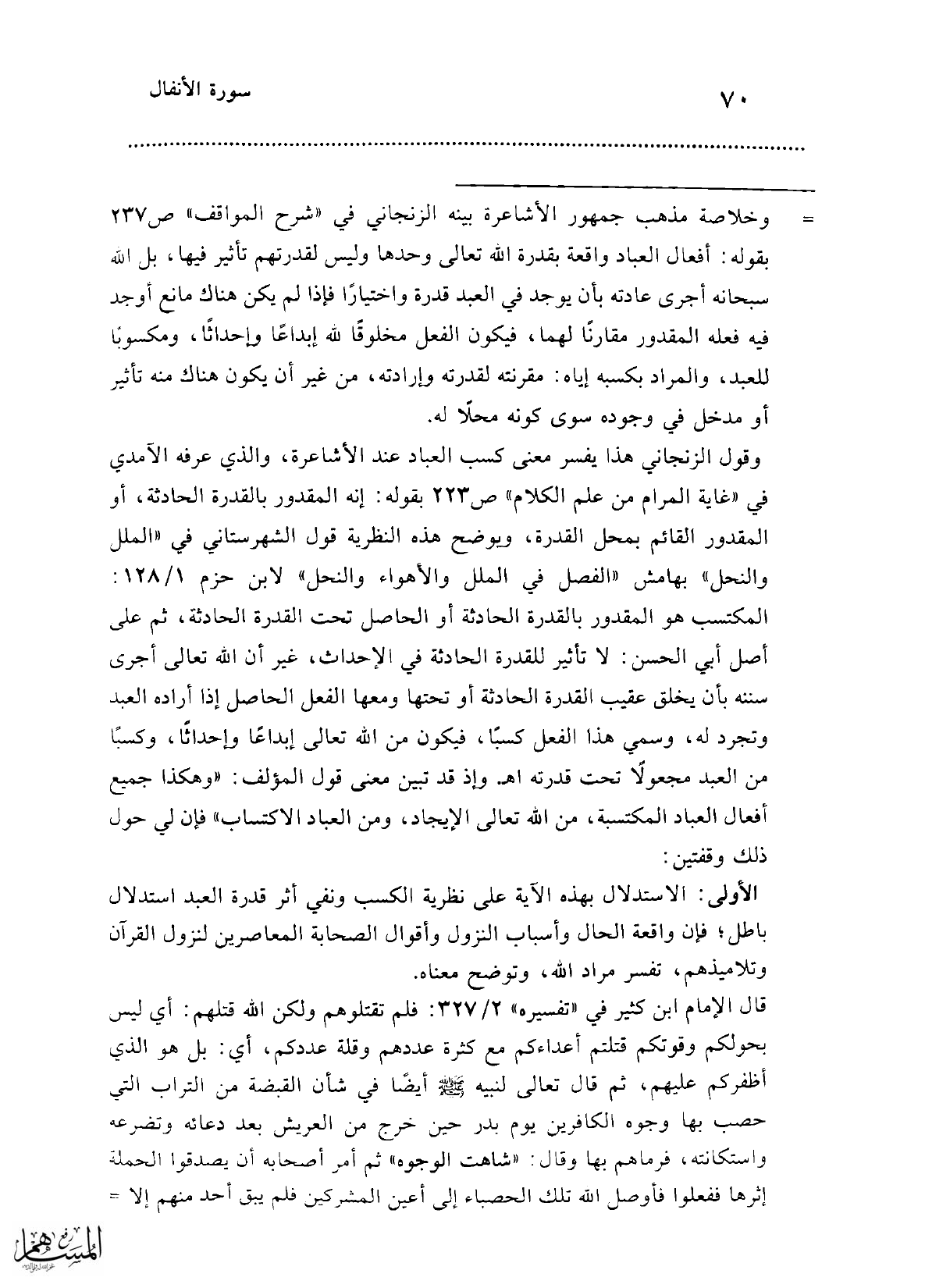 وقول الزنجاني هذا يفسر معنى كسب العباد عند الأشاعرة، والذي عرفه الآمدي في "غاية المرام من علم الكلام" ص 223 بقوله: إنه المقدور بالقدرة الحادثة، أو المقدور القائم بمحل القدرة، ويوضح هذه النظرية قول الشهرستاني في "الملل والنحل" بهامش "الفصل في الملل والأهواء والنحل" لابن حزم 1/ 128: المكتسب هو المقدور بالقدرة الحادثة أو الحاصل تحت القدرة الحادثة، ثم على أصل أبي الحسن: لا تأثير للقدرة الحادثة في الإحداث، غير أن الله تعالى أجرى سننه بأن يخلق عقيب القدرة الحادثة أو تحتها ومعها الفعل الحاصل إذا أراده العبد وتجرد له، وسمي هذا الفعل كسبًا، فيكون من الله تعالى إبداعًا وإحداثًا، وكسبًا من العبد مجعولًا تحت قدرته اهـ. وإذ قد تبين معنى قول المؤلف: "وهكذا جميع أفعال العباد المكتسبة، من الله تعالى الإيجاد، ومن العباد الاكتساب" فإن لي حول ذلك وقفتين: