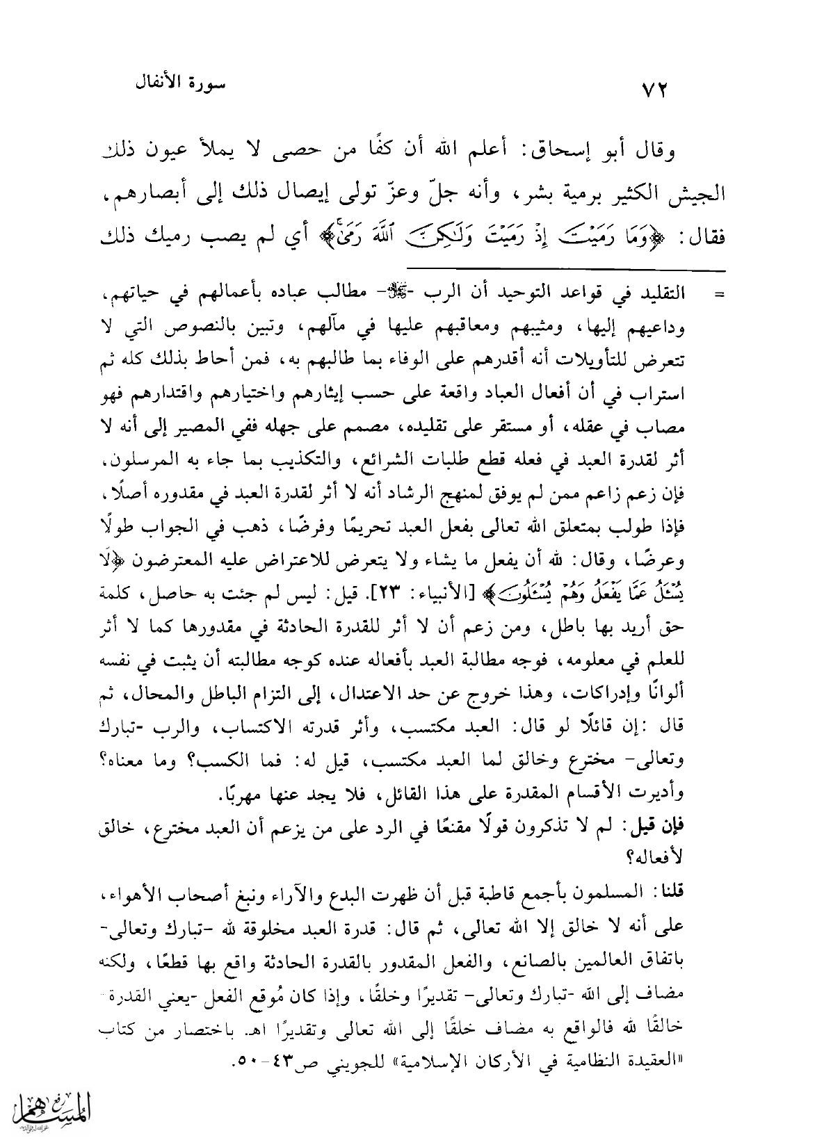 قلنا: المسلمون بأجمع قاطبة قبل أن ظهرت البدع والآراء ونبغ أصحاب الأهواء، على أنه لا خالق إلا الله تعالى، ثم قال: قدرة العبد مخلوقة لله -تبارك وتعالى- باتفاق العالمين بالصانع، والفعل المقدور بالقدرة الحادثة واقع بها قطعًا , ولكنه مضاف إلى الله -تبارك وتعالى- تقديرًا وخلقًا، وإذا كان مُوقع الفعل -يعني القدرة- خالقًا لله فالواقع به مضاف خلقًا إلى الله تعالى وتقديرًا اهـ. باختصار من كتاب "العقيدة النظامية في الأركان الإسلامية" للجويني ص 43 - 50.