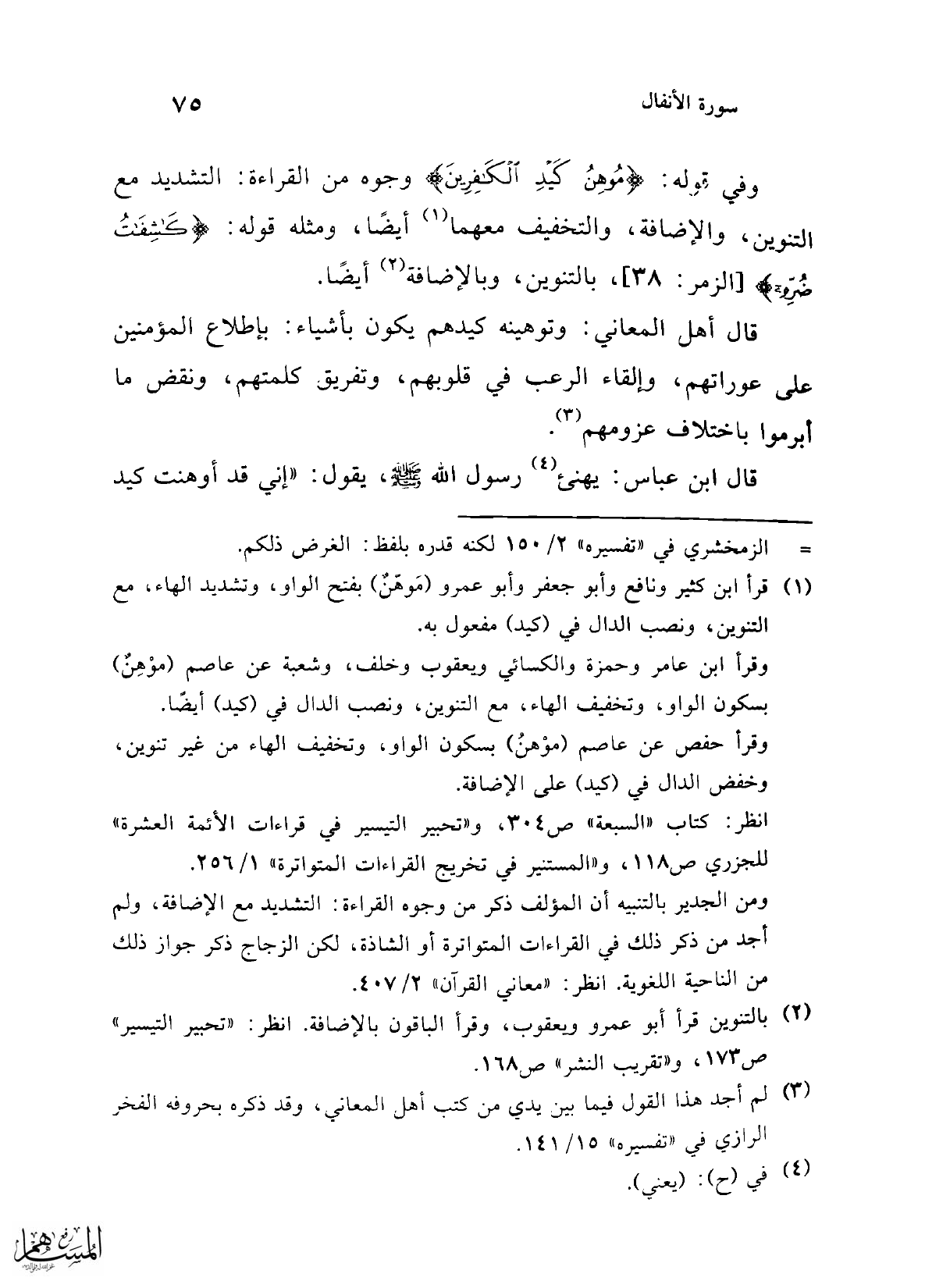 وفي قوله: {مُوهِنُ كَيْدِ الْكَافِرِينَ} وجوه من القراءة: التشديد مع التنوين، والإضافة، والتخفيف معهما (¬1) أيضًا، ومثله قوله: {كَاشِفَاتُ ضُرِّهِ} [الزمر: 38]، بالتنوين، وبالإضافة (¬2) أيضًا.