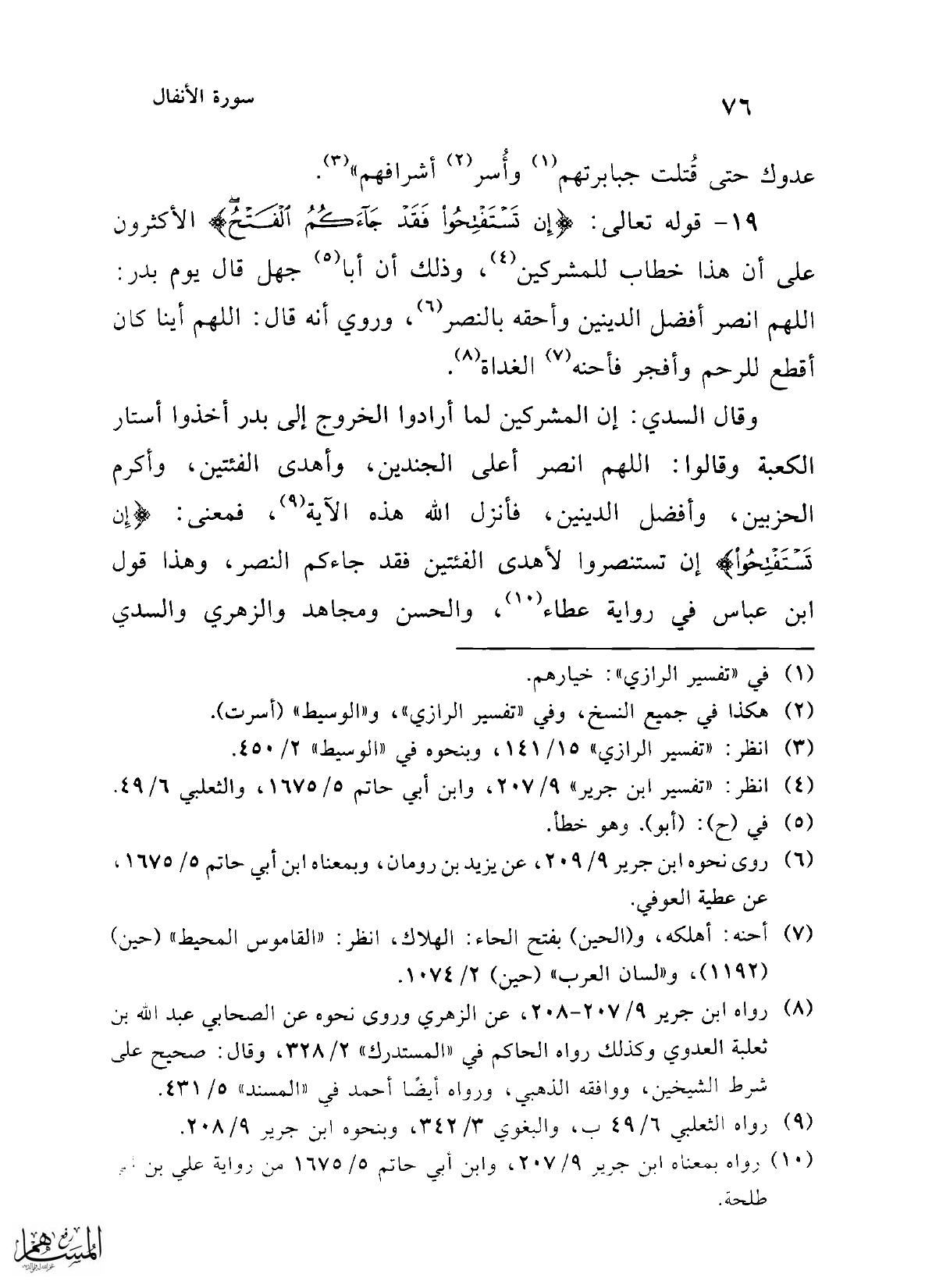 19 - قوله تعالى: {إِنْ تَسْتَفْتِحُوا فَقَدْ جَاءَكُمُ الْفَتْحُ} الأكثرون على أن هذا خطاب للمشركين (¬4)، وذلك أن أبا (¬5) جهل قال يوم بدر: اللهم انصر أفضل الدينين وأحقه بالنصر (¬6)، وروي أنه قال: اللهم أينا كان أقطع للرحم وأفجر فأحنه (¬7) الغداة (¬8).