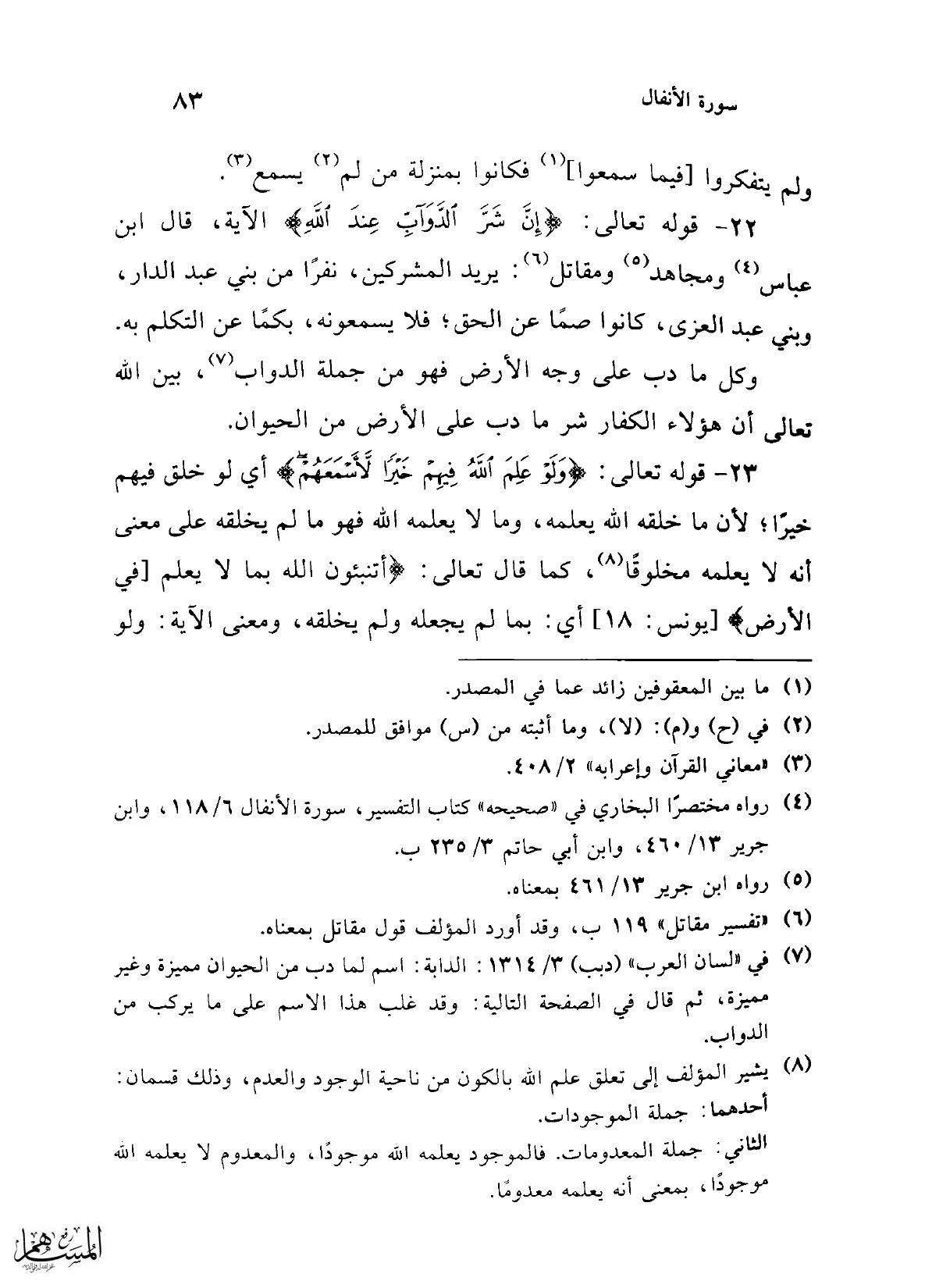 22 - قوله تعالى: {إِنَّ شَرَّ الدَّوَابِّ عِنْدَ اللَّهِ} الآية، قال ابن عباس (¬4) ومجاهد (¬5) ومقاتل (¬6): يريد المشركين، نفرًا من بني عبد الدار، وبني عبد العزى، كانوا صمًا عن الحق؛ فلا يسمعونه، بكمًا عن التكلم به.