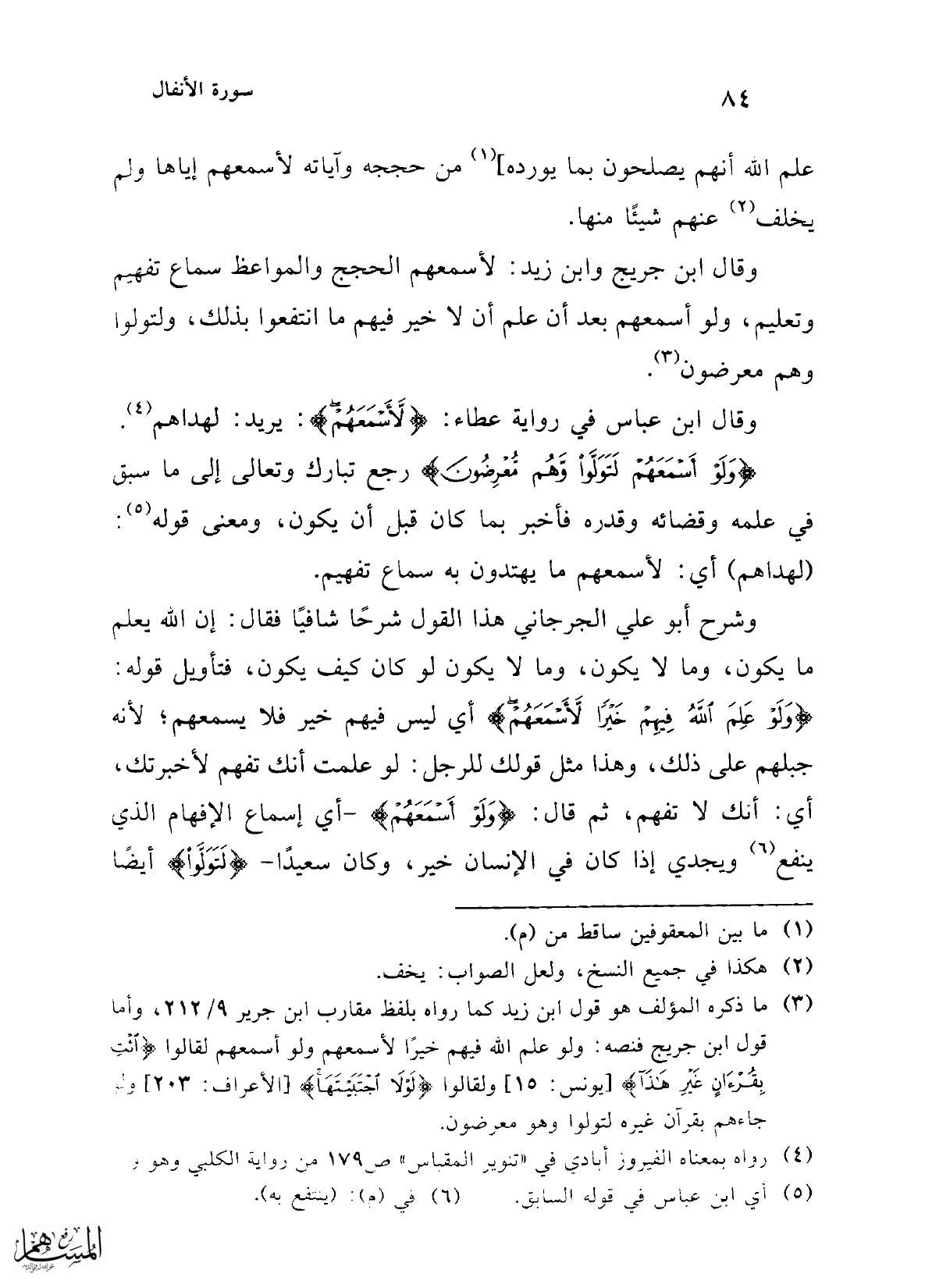 وشرح أبو علي الجرجاني هذا القول شرحًا شافيًا فقال: إن الله يعلم ما يكون، وما لا يكون، وما لا يكون لو كان كيف يكون، فتأويل قوله: {وَلَوْ عَلِمَ اللَّهُ فِيهِمْ خَيْرًا لَأَسْمَعَهُمْ} أي ليس فيهم خير فلا يسمعهم؛ لأنه جبلهم على ذلك، وهذا مثل قولك للرجل: لو علمت أنك تفهم لأخبرتك، أي: أنك لا تفهم، ثم قال: {وَلَوْ أَسْمَعَهُمْ} -أي إسماع الإفهام الذي ينفع (¬6) ويجدي إذا كان في الإنسان خير، وكان سعيدًا- {لَتَوَلَّوْا} أيضًا