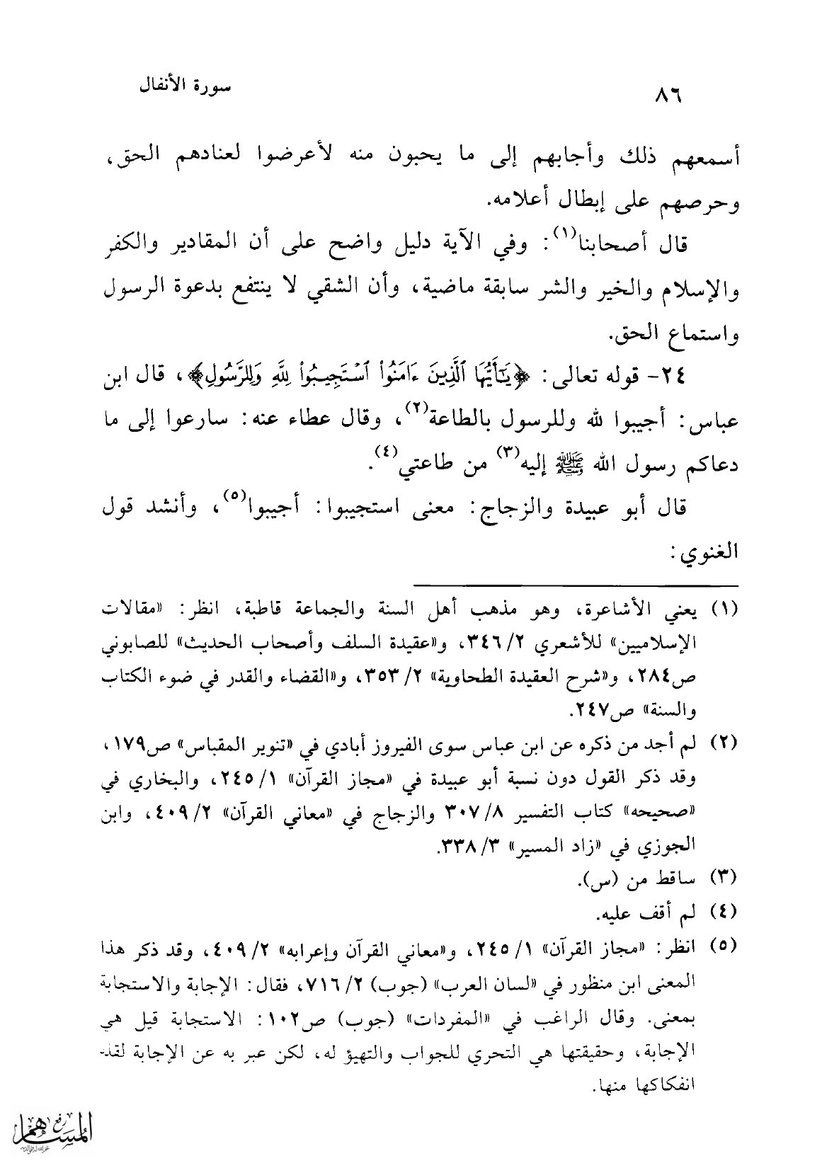 24 - قوله تعالى: {يَا أَيُّهَا الَّذِينَ آمَنُوا اسْتَجِيبُوا لِلَّهِ وَلِلرَّسُولِ}، قال ابن عباس: أجيبوا لله وللرسول بالطاعة (¬2)، وقال عطاء عنه: سارعوا إلى ما دعاكم رسول الله - صلى الله عليه وسلم - إليه (¬3) من طاعتي (¬4).