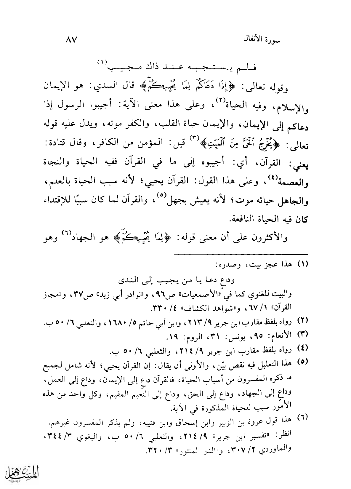 والأكثرون على أن معنى قوله: {لِمَا يُحْيِيكُمْ} هو الجهاد (¬6) وهو