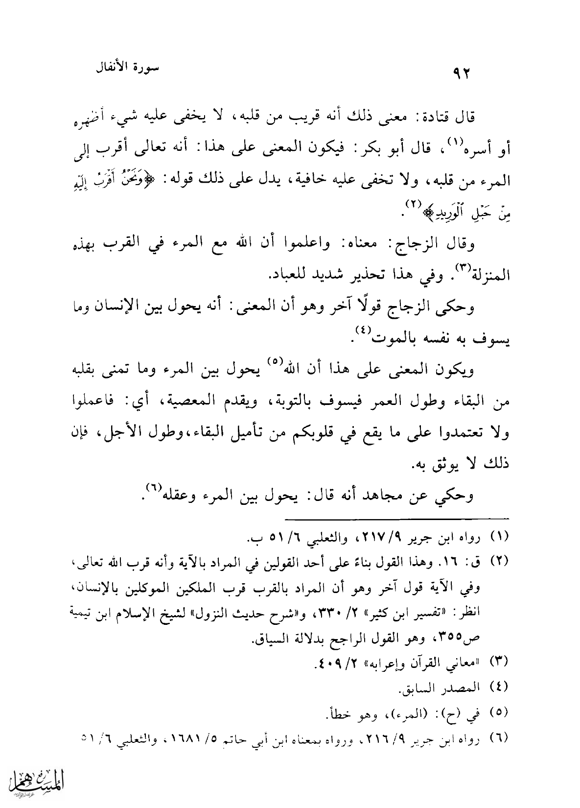 (¬2) ق: 16. وهذا القول بناءً على أحد القولين في المراد بالآية وأنه قرب الله تعالى، وفي الآية قول آخر وهو أن المراد بالقرب قرب الملكين الموكلين بالإنسان، انظر: "تفسير ابن كثير" 2/ 330، و"شرح حديث النزول" لشيخ الإِسلام ابن تيمية ص355، وهو القول الراجح بدلالة السياق.