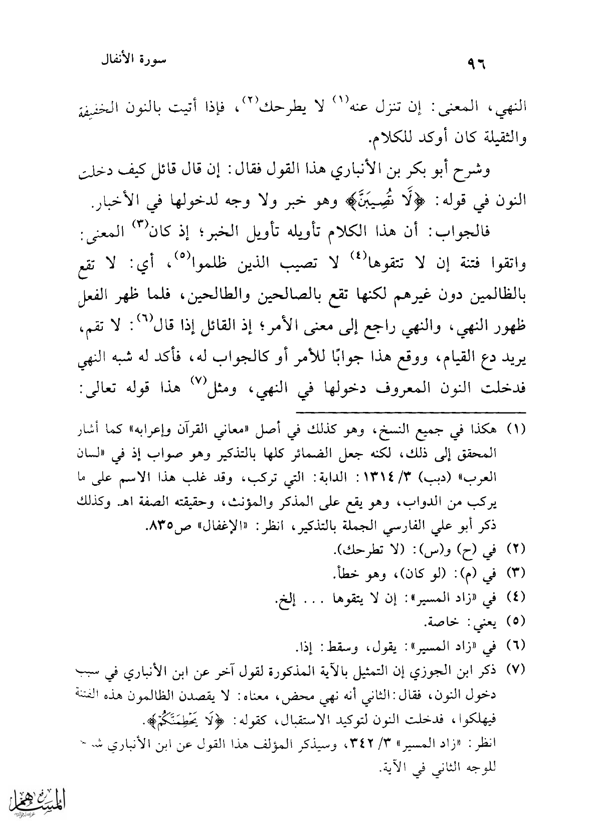 (¬7) ذكر ابن الجوزي إن التمثيل بالآية المذكورة لقول آخر عن ابن الأنباري في سبب دخول النون، فقال: الثاني أنه نهي محض، معناه: لا يقصدن الظالمون هذه الفتنة فيهلكوا، فدخلت النون لتوكيد الاستقبال، كقوله: {لَا يَحْطِمَنَّكُمْ}.
