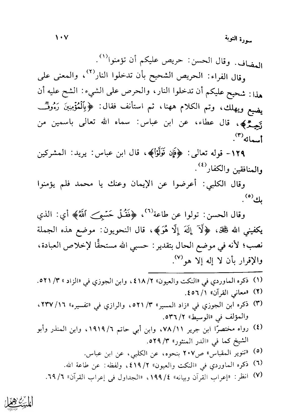 129 - قوله تعالى: {فَإِنْ تَوَلَّوْا}، قال ابن عباس: يريد: المشركين والمنافقين والكفار (¬4).