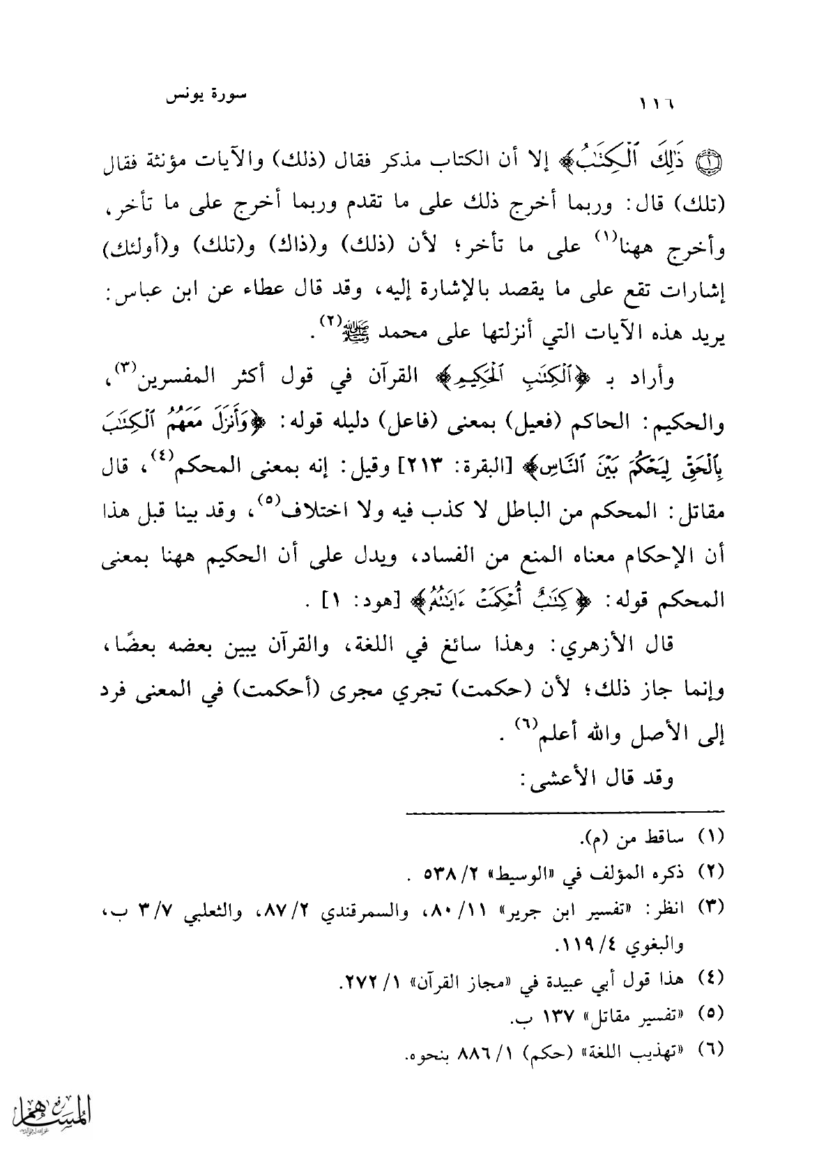 وأراد بـ {الْكِتَابِ الْحَكِيمِ} القرآن في قول أكثر المفسرين (¬3)، والحكيم: الحاكم (فعيل) بمعنى (فاعل) دليله قوله: {وَأَنْزَلَ مَعَهُمُ الْكِتَابَ بِالْحَقِّ لِيَحْكُمَ بَيْنَ النَّاسِ} [البقرة: 213] وقيل: إنه بمعنى المحكم (¬4)، قال مقاتل: المحكم من الباطل لا كذب فيه ولا اختلاف (¬5)، وقد بينا قبل هذا أن الأحكام معناه المنع من الفساد، ويدل على أن الحكيم هاهنا بمعنى المحكم قوله: {كِتَابٌ أُحْكِمَتْ آيَاتُهُ} [هود: 1].