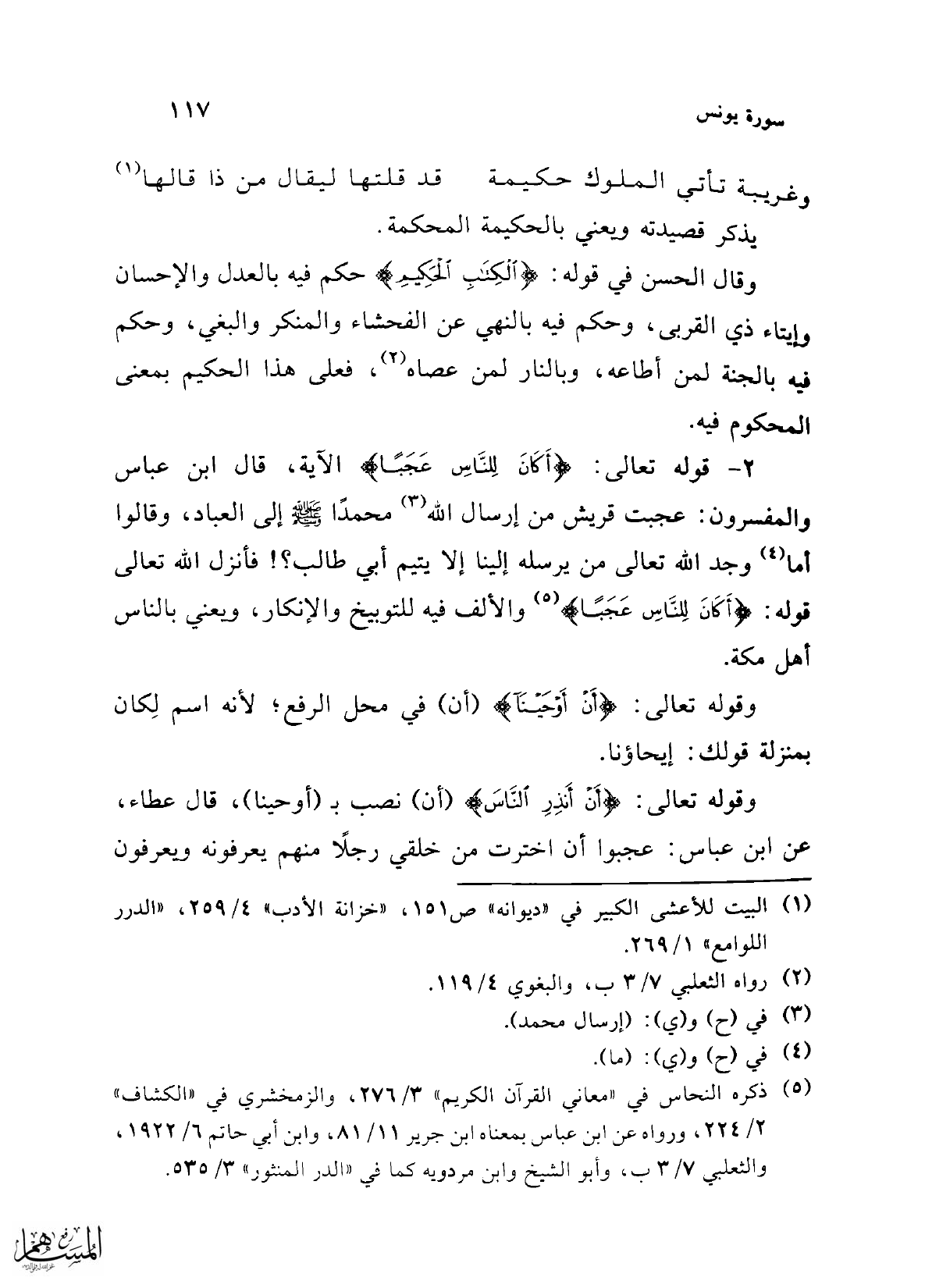وقال الحسن في قوله: {الْكِتَابِ الْحَكِيمِ} حكم فيه بالعدل والإحسان وإيتاء ذي القربى، وحكم فيه بالنهي عن الفحشاء والمنكر والبغي، وحكم فيه بالجنة لمن أطاعه، وبالنار لمن عصاه (¬2)، فعلى هذا الحكيم بمعنى المحكوم فيه.