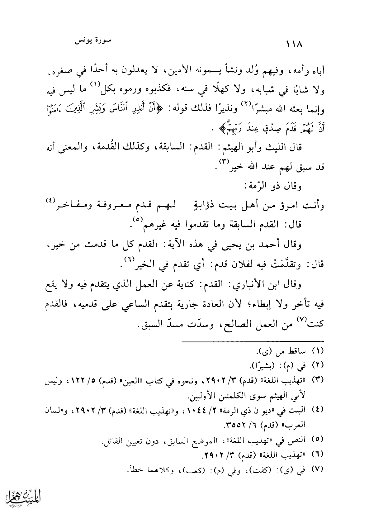 وقال أحمد بن يحيى في هذه الآية: القدم كل ما قدمت من خير، قال: وتقدَّمَتْ فيه لفلان قدم: أي تقدم في الخير (¬6).