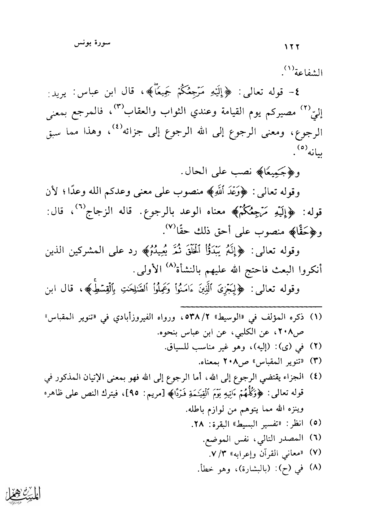 (¬4) الجزاء يقتضي الرجوع إلى الله، أما الرجوع إلى الله فهو بمعنى الإتيان المذكور في قوله تعالى: {وَكُلُّهُمْ آتِيهِ يَوْمَ الْقِيَامَةِ فَرْدً} [مريم: 95]، فيترك النص على ظاهره وينزه الله مما يتوهم من لوازم باطله.