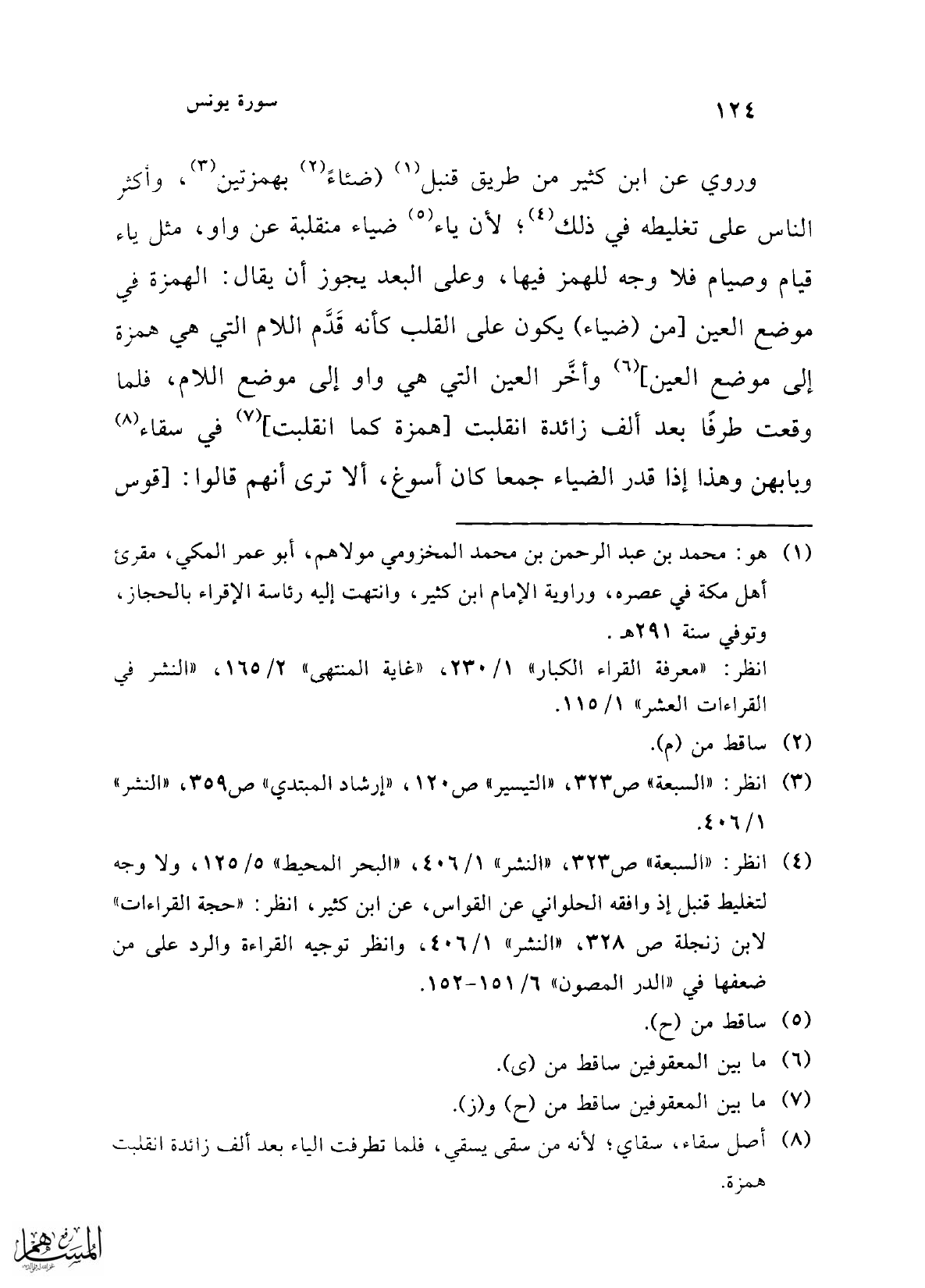 وروي عن ابن كثير من طريق قنبل (¬1) (ضئاءً (¬2) بهمزتين (¬3)، وأكثر الناس على تغليطه في ذلك (¬4)؛ لأن ياء (¬5) ضياء منقلبة عن واو، مثل ياء قيام وصيام فلا وجه للهمز فيها، وعلى البعد يجوز أن يقال: الهمزة في موضع العين [من (ضياء) يكون على القلب كأنه قَدَّم اللام التي هي همزة إلى موضع العين] (¬6) وأخَّر العين التي هي واو إلى موضع اللام، فلما وقعت طرفًا بعد ألف زائدة انقلبت [همزة كما انقلبت] (¬7) في سقاء (¬8) وبابهن وهذا إذا قدر الضياء جمعا كان أسوغ، ألا ترى أنهم قالوا: [قوس