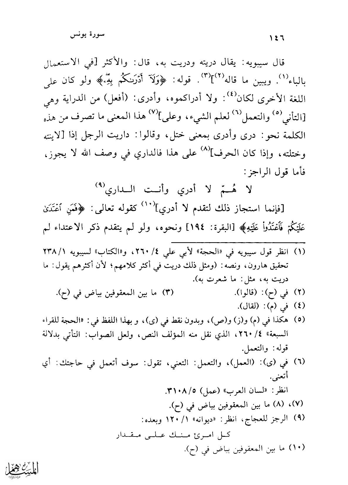 (1) انظر قول سيبويه في "الحجة" لأبي علي 4/ 260، و"الكتاب" لسيبويه 1/ 238 تحقيق هارون، ونصه: (ومثل ذلك دريت في أكثر كلامهم؛ لأن أكثرهم يقول: ما دريت به، مثل: ما شعرت به).