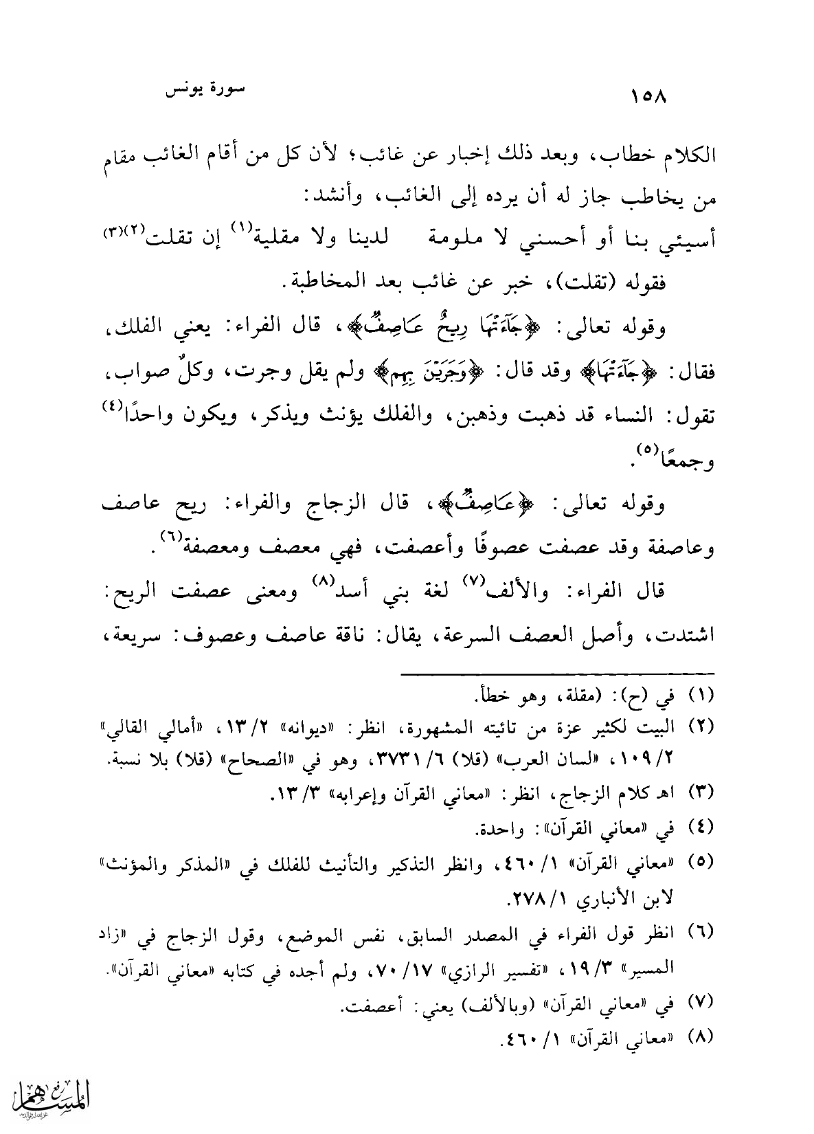 وقوله تعالى: {جَاءَتْهَا رِيحٌ عَاصِفٌ}، قال الفراء: يعني الفلك، فقال: {جَاءَتْهَا} وقد قال: {وَجَرَيْنَ بِهِمْ} ولم يقل وجرت، وكلٌ صواب، تقول: النساء قد ذهبت وذهبن، والفلك يؤنث ويذكر، ويكون واحداً (¬4) وجمعًا (¬5).