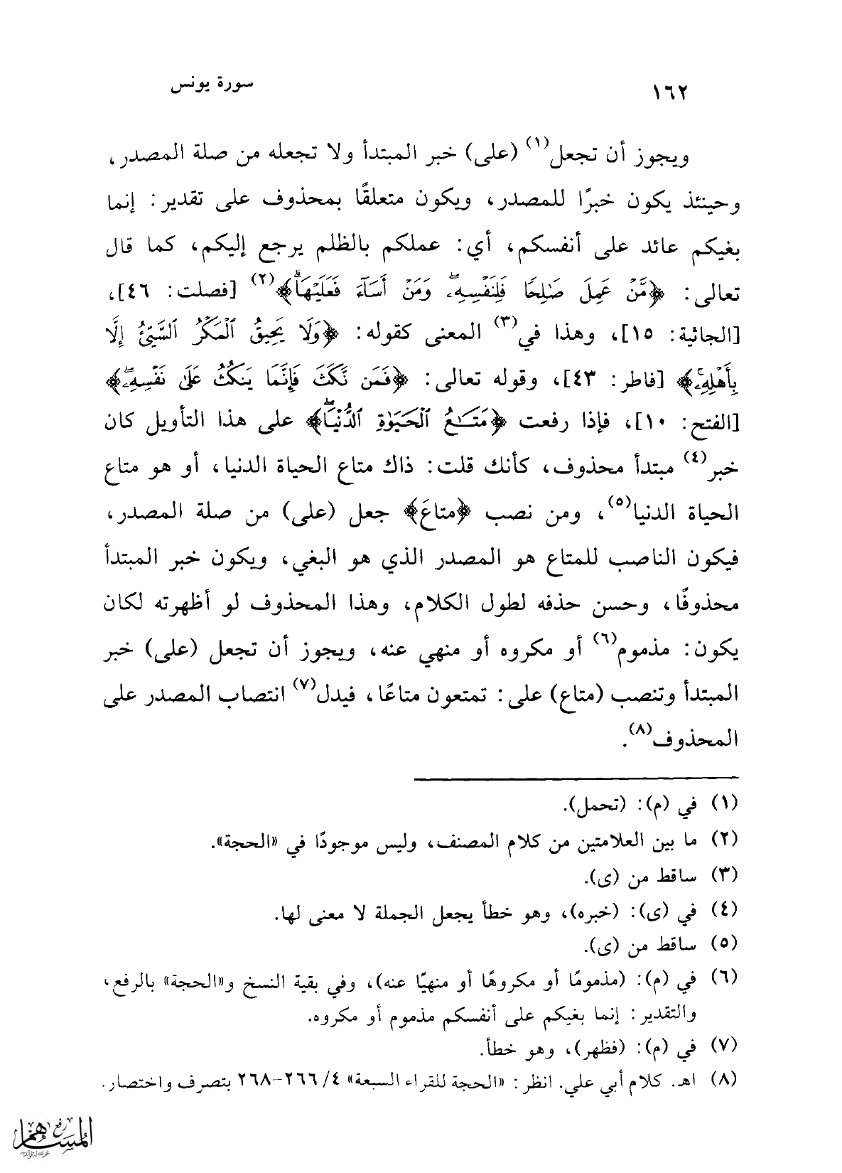 (¬6) في (م): (مذمومًا أو مكروهًا أو منهيًا عنه)، وفي بقية النسخ و"الحجة" بالرفع، والتقدير: إنما بغيكم على أنفسكم مذموم أو مكروه.