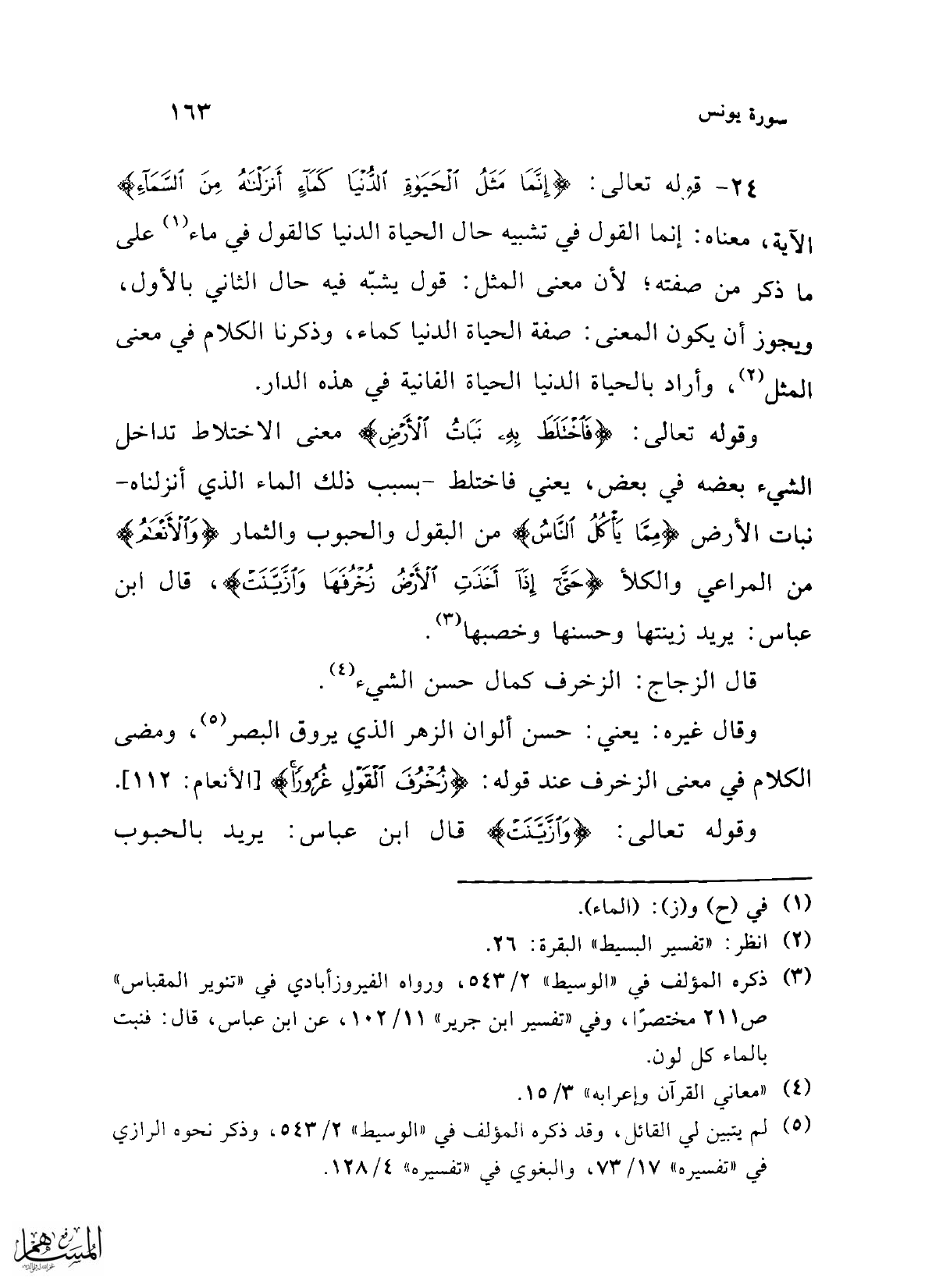 24 - قوله تعالى: {إِنَّمَا مَثَلُ الْحَيَاةِ الدُّنْيَا كَمَاءٍ أَنْزَلْنَاهُ مِنَ السَّمَاءِ} الآية، معناه: إنما القول في تشبيه حال الحياة الدنيا كالقول في ماء (¬1) علي ما ذكر من صفته؛ لأن معنى المثل: قول يشبّه فيه حال الثاني بالأول، ويجوز أن يكون المعنى: صفة الحياة الدنيا كماء، وذكرنا الكلام في معنى المثل (¬2)، وأراد بالحياة الدنيا الحياة الفانية في هذه الدار.