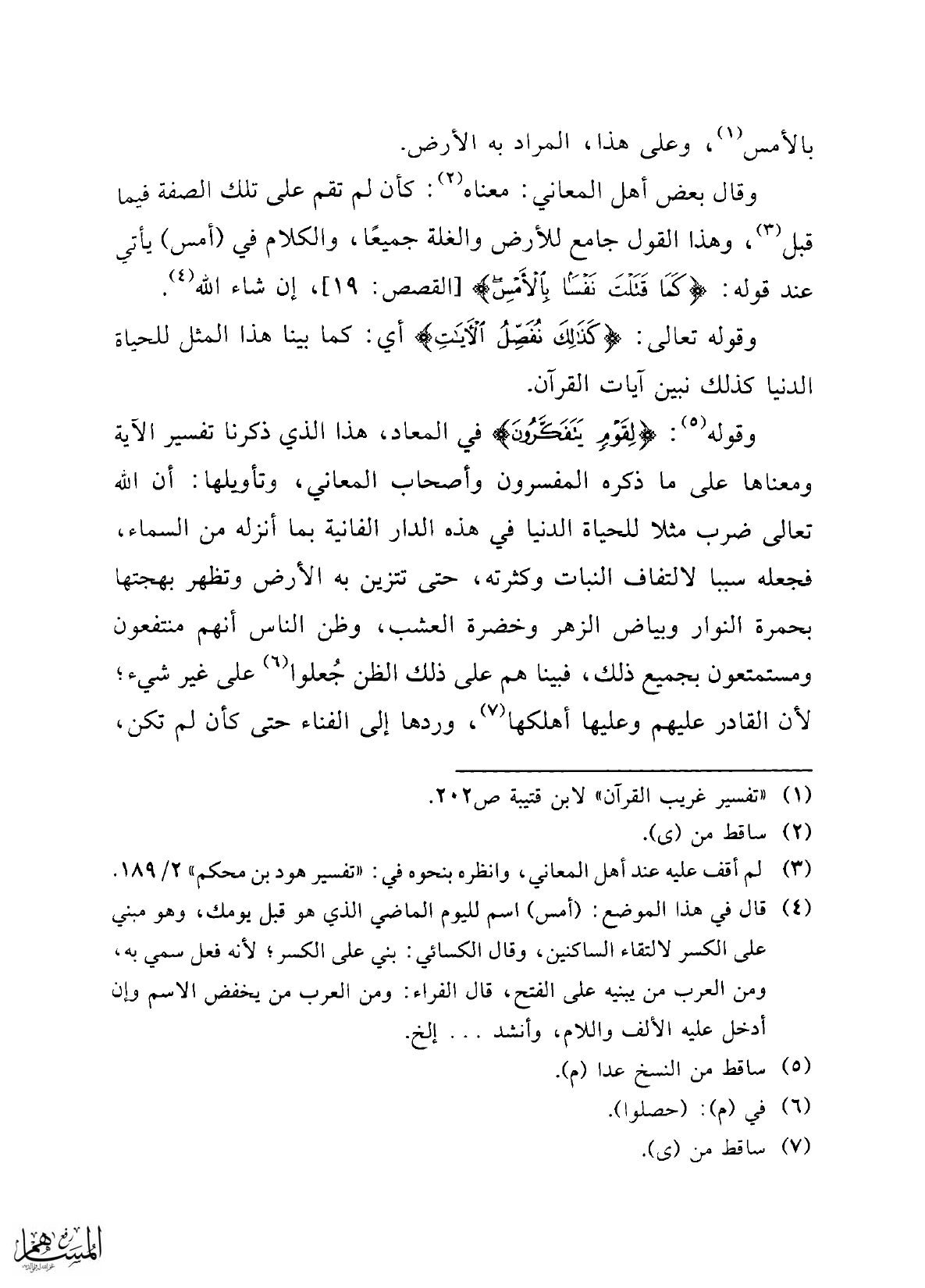وقوله (¬5): {لِقَوْمٍ يَتَفَكَّرُونَ} في المعاد، هذا الذي ذكرنا تفسير الآية ومعناها على ما ذكره المفسرون وأصحاب المعاني، وتأويلها: أن الله تعالى ضرب مثلا للحياة الدنيا في هذه الدار الفانية بما أنزله من السماء، فجعله سببا لالتفاف النبات وكثرته، حتى تتزين به الأرض وتظهر بهجتها بحمرة النوار وبياض الزهر وخضرة العشب، وظن الناس أنهم منتفعون ومستمتعون بجميع ذلك، فبينا هم على ذلك الظن جُعلوا (¬6) على غير شيء؛ لأن القادر عليهم وعليها أهلكها (¬7)، وردها إلى الفناء حتى كأن لم تكن،