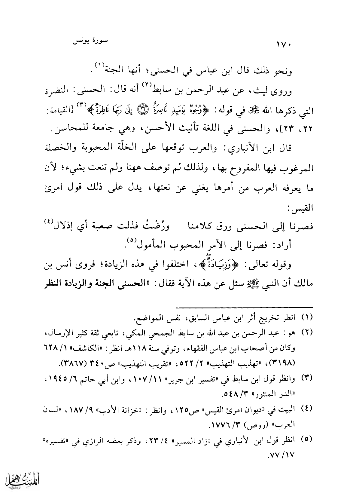 وروى ليث، عن عبد الرحمن بن سابط (¬2) أنه قال: الحسنى: النضرة التي ذكرها الله -عز وجل- في قوله: {وُجُوهٌ يَوْمَئِذٍ نَاضِرَةٌ (22) إِلَى رَبِّهَا نَاظِرَةٌ} (¬3) [القيامة: 22، 23]، والحسنى في اللغة تأنيث الأحسن، وهي جامعة للمحاسن.
