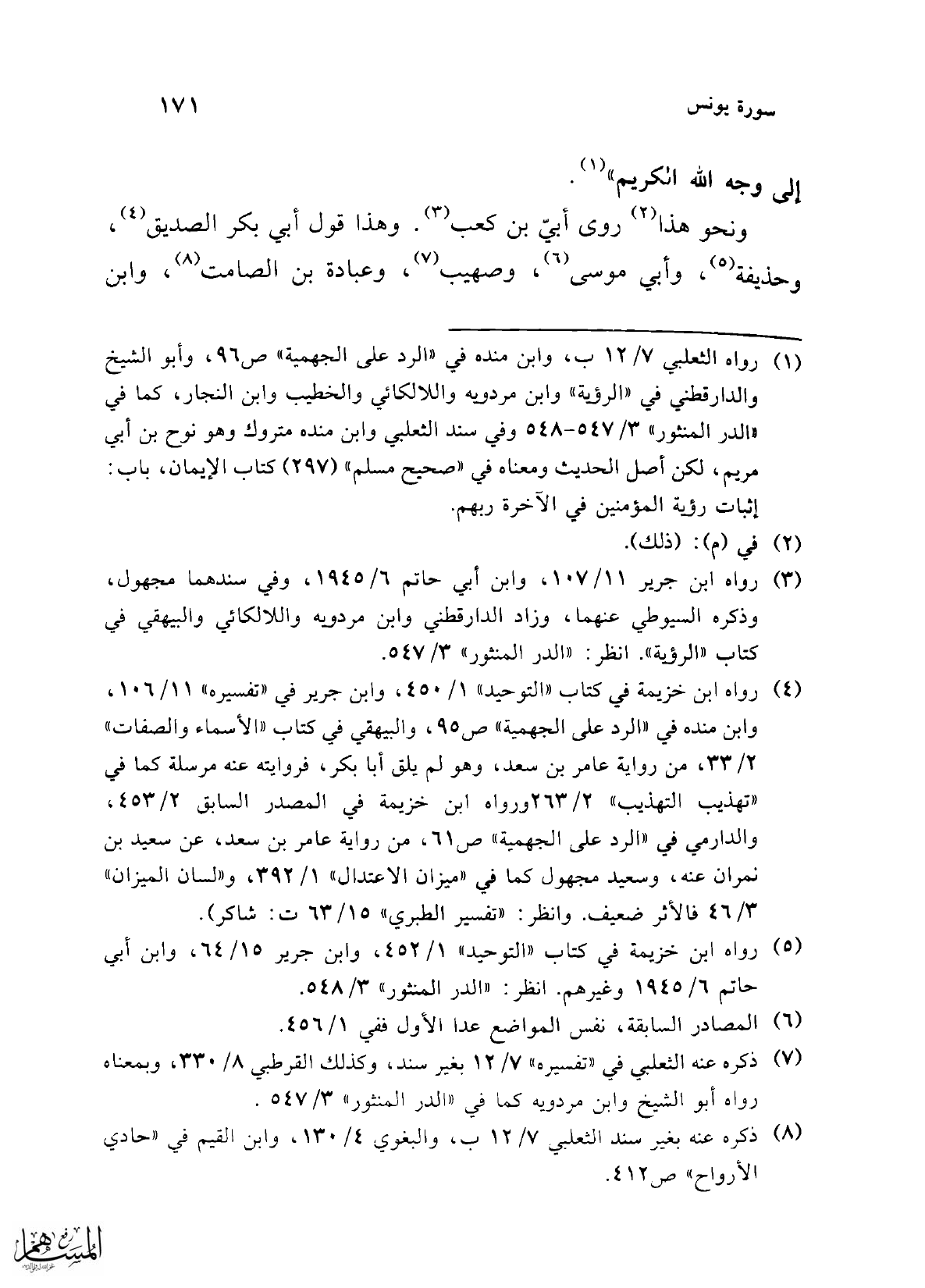 (¬1) رواه الثعلبي 7/ 12 ب، وابن منده في "الرد على الجهمية" ص 96، وأبو الشيخ والدارقطني في "الرؤية" وابن مردويه واللالكائي والخطيب وابن النجار، كما في "الدر المنثور" 3/ 547 - 548 وفي سند الثعلبي وابن منده متروك وهو نوح بن أبي مريم، لكن أجل الحديث ومعناه في "صحيح مسلم" (297) كتاب الإيمان، باب: إثبات رؤية المؤمنين في الآخرة ربهم.