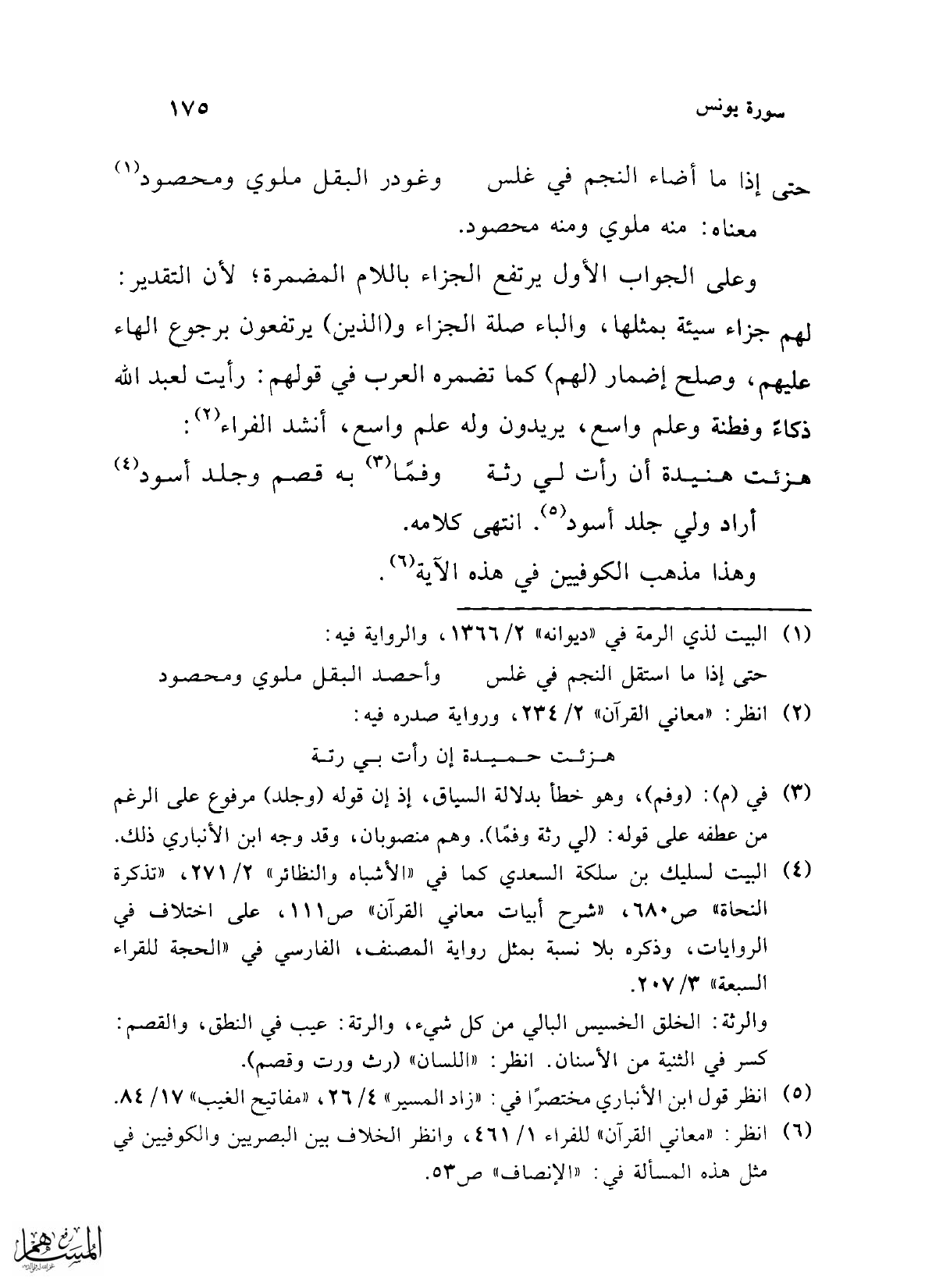 وعلى الجواب الأول يرتفع الجزاء باللام المضمرة؛ لأن التقدير: لهم جزاء سيئة بمثلها، والباء صلة الجزاء و (الذين) يرتفعون برجوع الهاء عليهم، وصلح إضمار (لهم) كما تضمره العرب في قولهم: رأيت لعبد الله ذكاءً وفطنة وعلم واسع، يريدون وله علم واسع، أنشد الفراء (¬2):