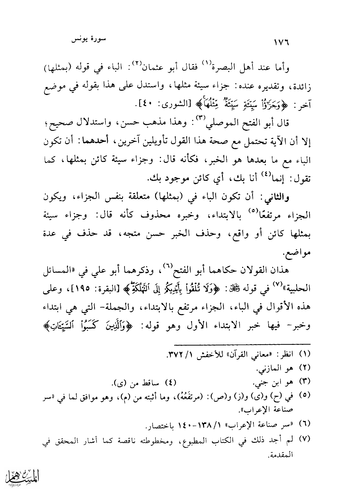 وأما عند أهل البصرة (¬1) فقال أبو عثمان (¬2): الباء في قوله (بمثلها) زائدة، وتقديره عنده: جزاء سيئة مثلها، واستدل على هذا بقوله في موضع آخر: {وَجَزَاءُ سَيِّئَةٍ سَيِّئَةٌ مِثْلُهَا} [الشورى: 40].