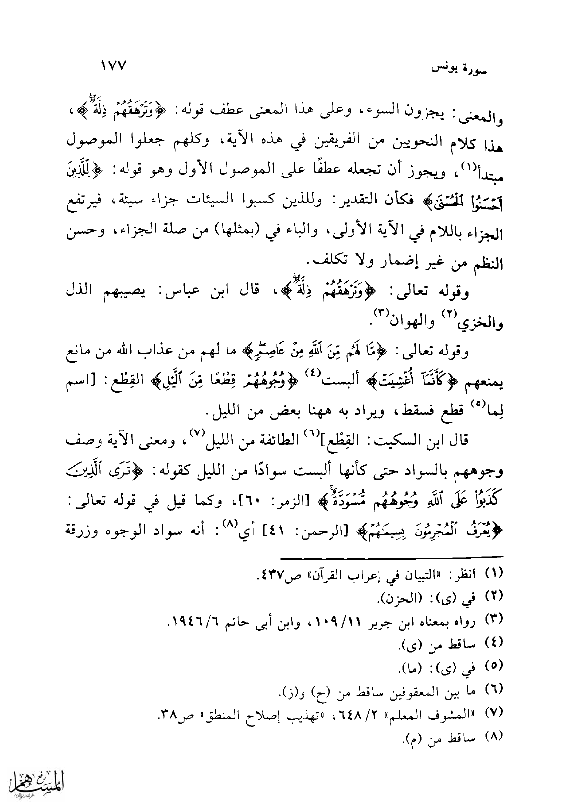 والمعني: يجزون السوء، وعلى هذا المعنى عطف قوله: {وَتَرْهَقُهُمْ ذِلَّةٌ}، هذا كلام النحويين من الفريقين في هذه الآية، وكلهم جعلوا الموصول مبتدأ (¬1)، ويجوز أن تجعله عطفًا على الموصول الأول وهو قوله: {لِلَّذِينَ أَحْسَنُوا الْحُسْنَى} فكأن التقدير: وللذين كسبوا السيئات جزاء سيئة، فيرتفع الجزاء باللام في الآية الأولى، والباء في (بمثلها) من صلة الجزاء، وحسن النظم من غير إضمار ولا تكلف.
