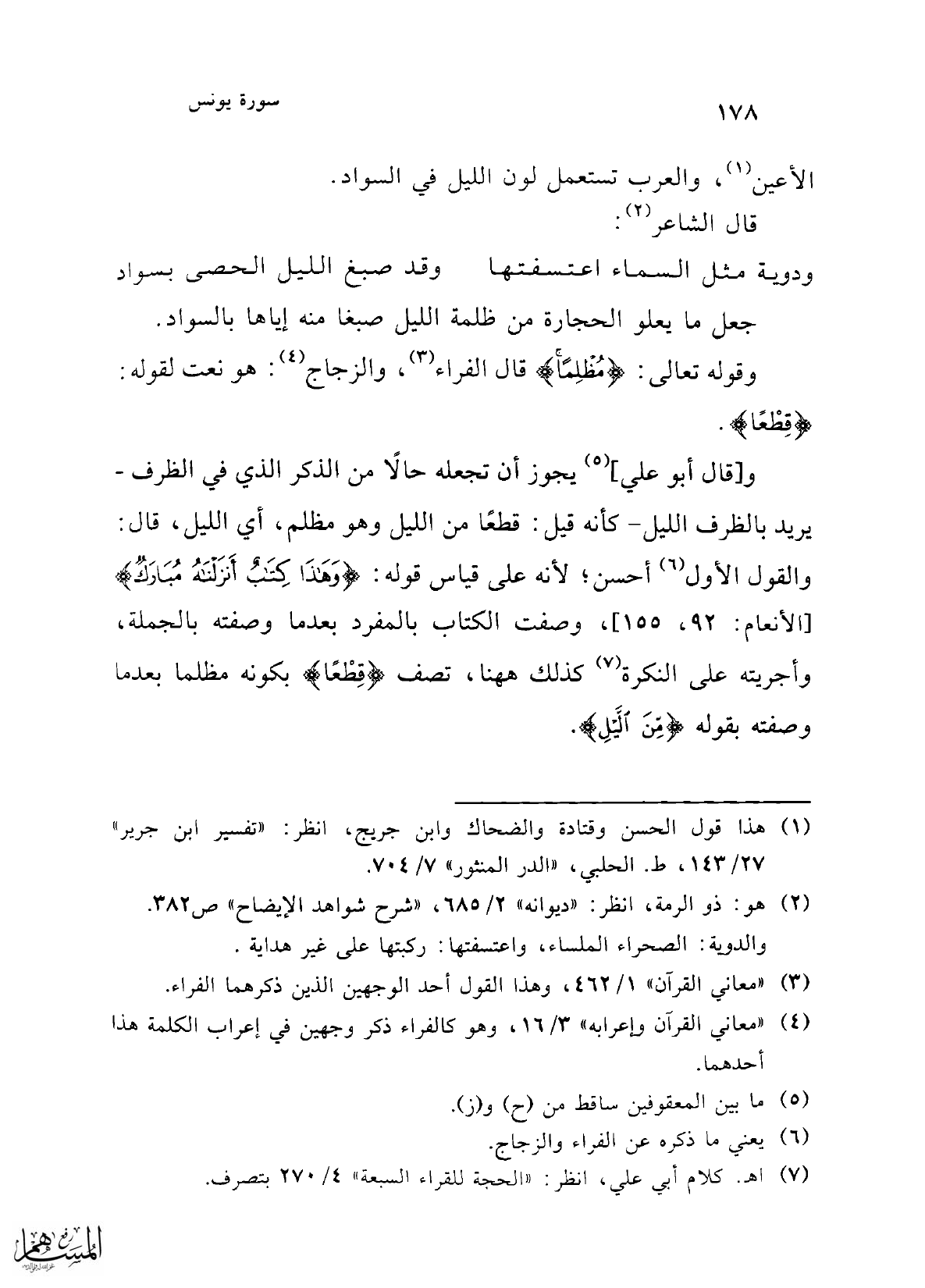 وقوله تعالى: {مُظْلِمًا} قال الفراء (¬3)، والزجاج (¬4): هو نعت لقوله: {قِطَعًا}.