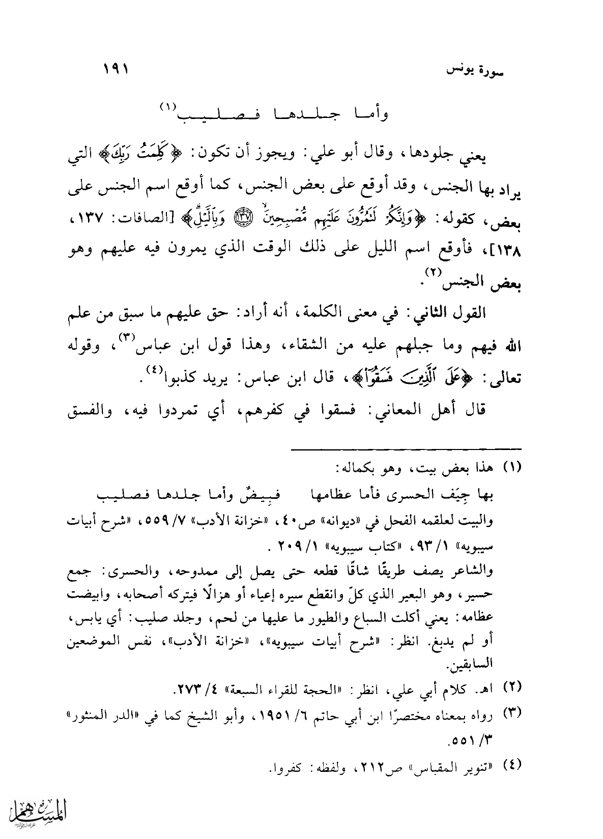 يعني جلودها، وقال أبو علي: ويجوز أن تكون: {كَلِمَتُ رَبِّكَ} التي يراد بها الجنس، وقد أوقع على بعض الجنس، كما أوقع اسم الجنس على بض، كقوله: {وَإِنَّكُمْ لَتَمُرُّونَ عَلَيْهِمْ مُصْبِحِينَ (137) وَبِاللَّيْلِ} [الصافات: 137، 138]، فأوقع اسم الليل على ذلك الوقت الذي يقرون فيه عليهم وهو بعض الجنس (¬2).