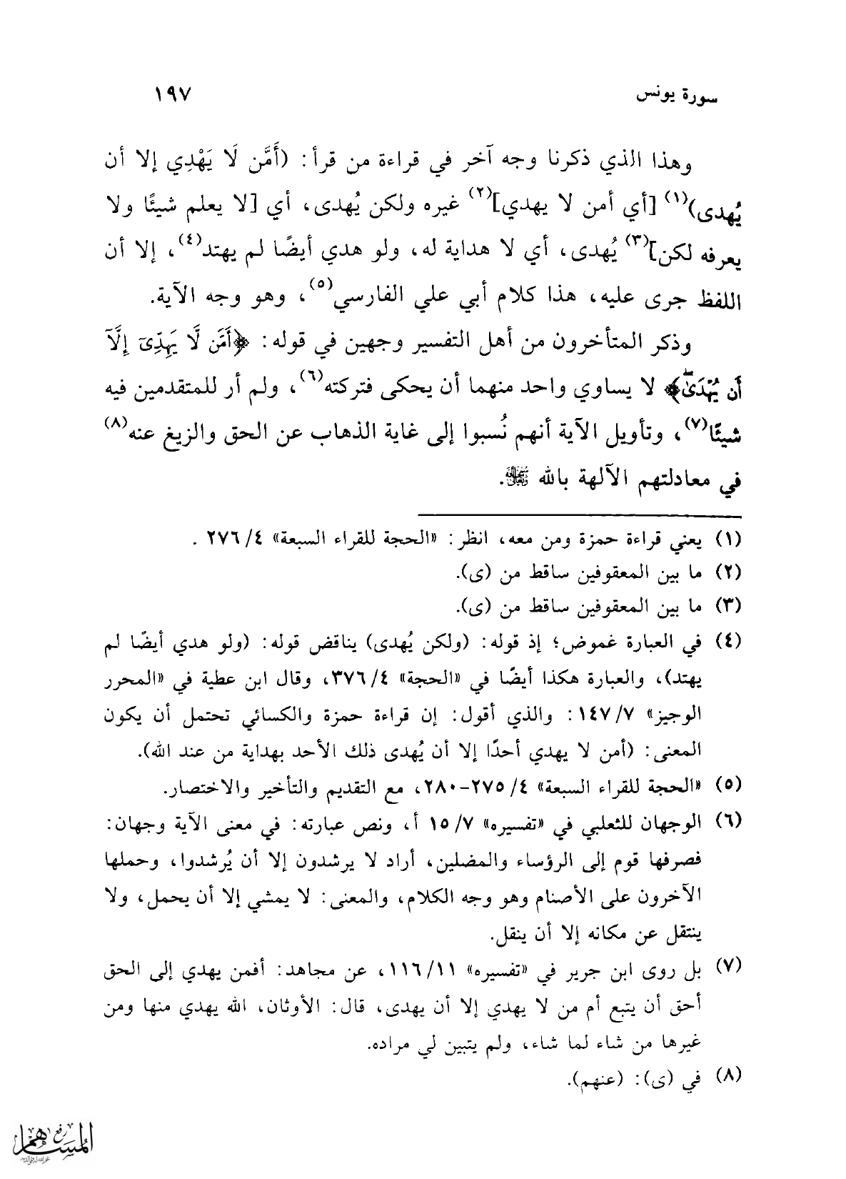 (¬4) في العبارة غموض؛ إذ قوله: (ولكن يُهدى) يناقض قوله: (ولو هدي أيضًا لم يهتد)، والعبارة هكذا أيضاً في "الحجة" 4/ 376، وقال ابن عطية في "المحرر الوجيز" 7/ 147: والذي أقول: إن قراءة حمزة والكسائي تحتمل أن يكون المعنى: (أمن لا يهدي أحدًا إلا أن يُهدى ذلك الأحد بهداية من عند الله).